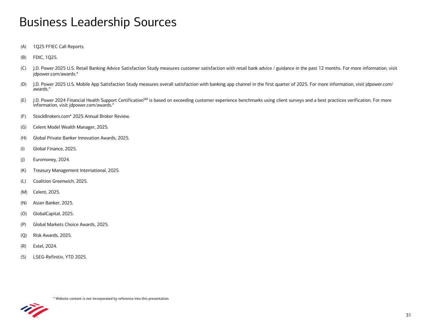 商业领导来源(a)1Q25 FFIEC电话报告。(b)FDIC,1Q25。(c)J.D. Power 2025美国零售银行建议满意度研究衡量过去12个月客户对零售银行建议/指导的满意度。欲了解更多信息,请访问jdpower.com/awards。*(d)J.D. Power 2025美国移动应用程序满意度研究衡量2025年第一季度银行应用程序渠道的总体满意度。欲了解更多信息,请访问jdpower.com/awards。*(e)J.D. Power 2024财务健康支持认证SM基于使用客户调查和最佳实践验证超越客户体验基准。欲了解更多信息,请访问jdpower.com/awards。*(f)StockBrokers.com*2025年年度经纪人审查。(g)Celent Model Wealth Manager,2025。(h)2025年全球私人银行家创新奖。(i)《2025年全球金融》。(J)《欧洲货币》,2024年。(k)Treasury Management International,2025。(l)格林威治联盟,2025年。(m)Celent,2025。(n)《亚洲银行家》,2025年。(O)GlobalCapital,2025。(p)2025年全球市场选择奖。(Q)风险奖,2025年。(r)Extel,2024年。(s)LSEG-Refinitiv,2025年初至今。31*网站内容未通过引用并入本演示文稿。