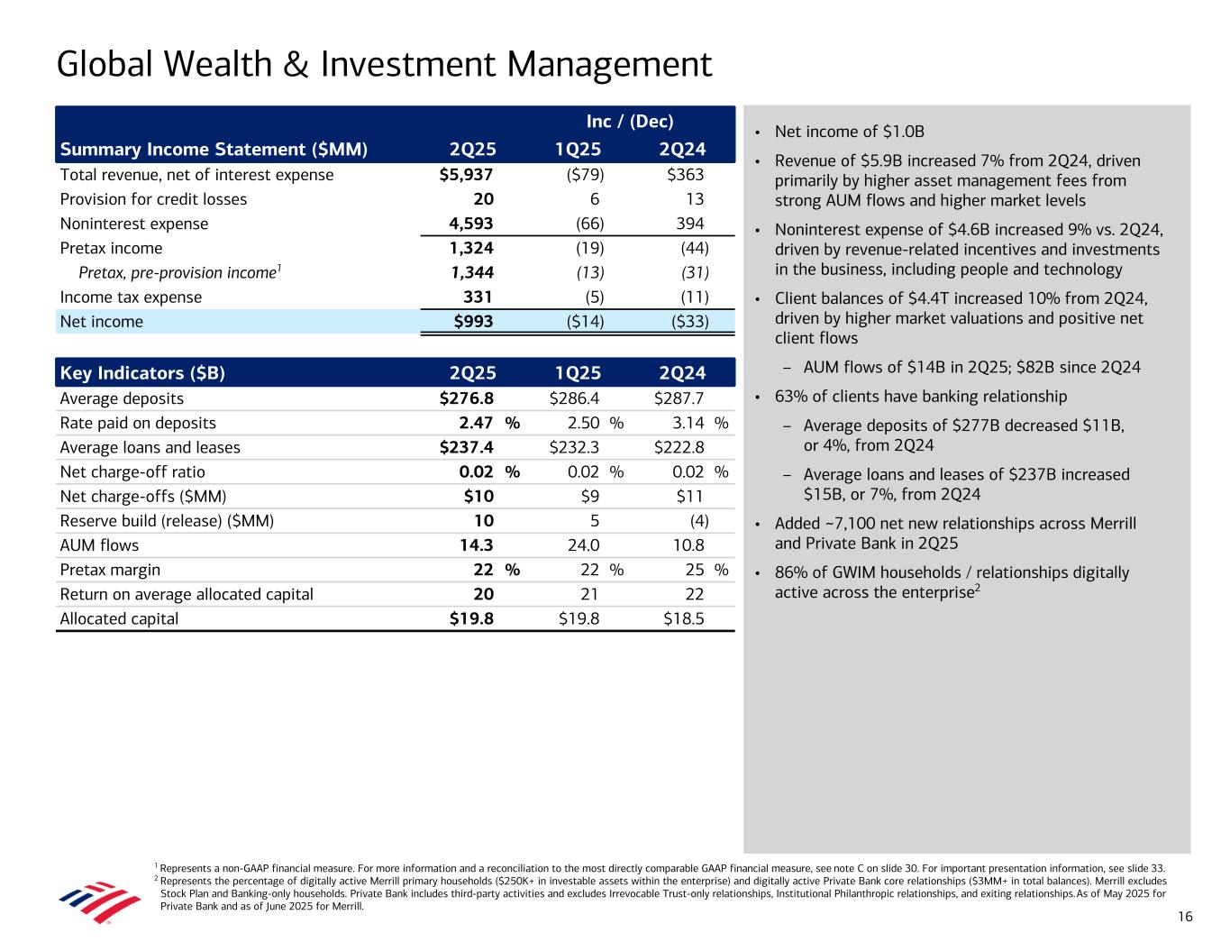 •净收入$ 1.0b •收入$ 5.9b较2Q24增长7%,主要是由于强劲的AUM流动和更高的市场水平导致资产管理费用增加•非利息费用$ 4.6b较2Q24增长9%,这是由与收入相关的激励措施和对业务的投资(包括人员和技术)推动的•客户余额为$ 4.4T较2Q24增长10%,这是由更高的市场估值和正的客户净流量推动的– 2Q25的AUM流量为$ 14B;自2Q24以来$ 82B • 63%的客户有银行关系–平均存款$ 277B减少$ 11B,即4%,从2Q24开始– 237B美元的平均贷款和租赁比2Q24增加了15B美元,即7% • 2Q25美林和私人银行增加了约7,100个净新关系• 86%的GWIM家庭/关系在整个企业中以数字方式活跃2全球财富与投资管理1代表了一种非公认会计准则财务指标。有关更多信息以及与最直接可比的GAAP财务指标的对账,请参见幻灯片30的附注C。有关重要的演示信息,请参见幻灯片33。2表示数字活跃的美林初级家庭(企业内可投资资产25万美元+)和数字活跃的私人银行核心关系(总余额300万美元+)的百分比。美林不包括股票计划和仅限银行业务的家庭。私人银行包括第三方活动,不包括不可撤销的纯信托关系、机构慈善关系和退出关系。私人银行截至2025年5月,美林截至2025年6月。Inc/(12月)损益表摘要(百万美元)2Q25 1Q25 2Q24总收入,扣除利息费用$ 5,937($ 79)$ 363信贷损失准备金20613非利息费用4,593(66)394税前收入1,324(19)(44)税前,拨备前收入11,344(13)(31)所得税费用331(5)(11)净收入$ 993($ 14)($ 33)关键指标($ B)2Q25 1Q25 2Q24平均存款$ 276.8 $ 286.4 $ 287.7存款支付率2.47% 2.50% 3.14%平均贷款和租赁$ 237.4 $ 232.3 $ 222.8净冲销率0.02% 0.02%净冲销($ mm)$ 10 $ 9 $ 11储备建立(释放)($ mm)105(4)AUM流动14.32 4.0 10.8税前利润率22% 25%平均分配资本回报率202122分配资本$ 19.8 $ 19.8 $ 18.516