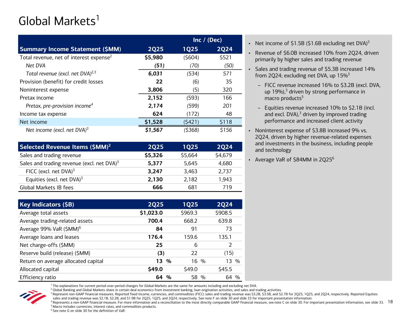 •净收入$ 1.5B($ 1.6B不包括净DVA)3 •收入$ 6.0B比2Q24增长10%,主要受销售和交易收入增加的推动•销售和交易收入$ 5.3B比2Q24增长14%;不包括净DVA,增长15% 3 – FICC收入增长16%至$ 3.2B(不包括DVA,上涨19%),3受宏观产品强劲表现的推动5 –股票收入增长10%至$ 2.1B(包括和不包括DVA),3受交易业绩改善和客户活动增加的推动•非利息费用为$ 3.8B,与2Q24相比增长9%,这是由于与收入相关的费用以及对包括人员和技术在内的业务的投资增加• 2Q256全球市场的平均VAR为$ 84mm 1 Global Markets的本期同期变化的解释对于包括和不包括净DVA的金额是相同的。2 Global Banking and Global Markets share in certain deal economics from investment banking,loan origination activities,and sales and trading activities。3代表非GAAP财务指标。报告的固定收益、货币和商品(FICC)销售和交易收入在2Q25、1Q25和2Q24分别为$ 3.2B、$ 3.5B和$ 2.7B。2Q25、1Q25和2Q24报告的股票销售和交易收入分别为$ 2.1B、$ 2.2B和$ 1.9B。有关重要的演示信息,请参见幻灯片30和幻灯片33上的注释F。4代表非GAAP财务指标。有关更多信息以及与最直接可比的GAAP财务指标的对账,请参见幻灯片30的附注C。有关重要的演示信息,请参见幻灯片33。5宏观包括货币、利率、大宗商品产品。6 VaR的定义见幻灯片30的注释G。Inc/(Dec)摘要损益表($ MM)2Q25 1Q25 2Q24总收入,扣除利息支出2 $ 5,980($ 604)$ 521净DVA(51)(70)(50)总收入(不包括净DVA)2,36,031(534)571信贷损失准备金(收益)22(6)35非利息支出3,806(5)320税前收入2,152(593)166税前,拨备前收入42,174(599)201所得税费用624(172)48净收入$ 1,528($ 421)$ 118净收入(不含净额DVA)3 $ 1,567($ 368)$ 156选定收入项目($ mm)2 2Q25 1Q25 2Q24销售和交易收入$ 5,326 $ 5,664 $ 4,679销售和交易收入(不含净额DVA)35,3775,6454,680 FICC(不含净额DVA)33,2473,4632,737股票(不含净额DVA)32,1302,1821,943 Global Markets IB费用666681719关键指标($ B)2Q25 1Q25 2Q24平均总资产$ 1,023.1和租赁176.4 159.61 35.1净冲销(百万美元)2562储备建设(释放)(百万美元)(3)22(15)平均分配资本回报率13% 16% 13%分配资本$ 49.0 $ 49.0 $ 45.5效率比64% 58% 64% 18