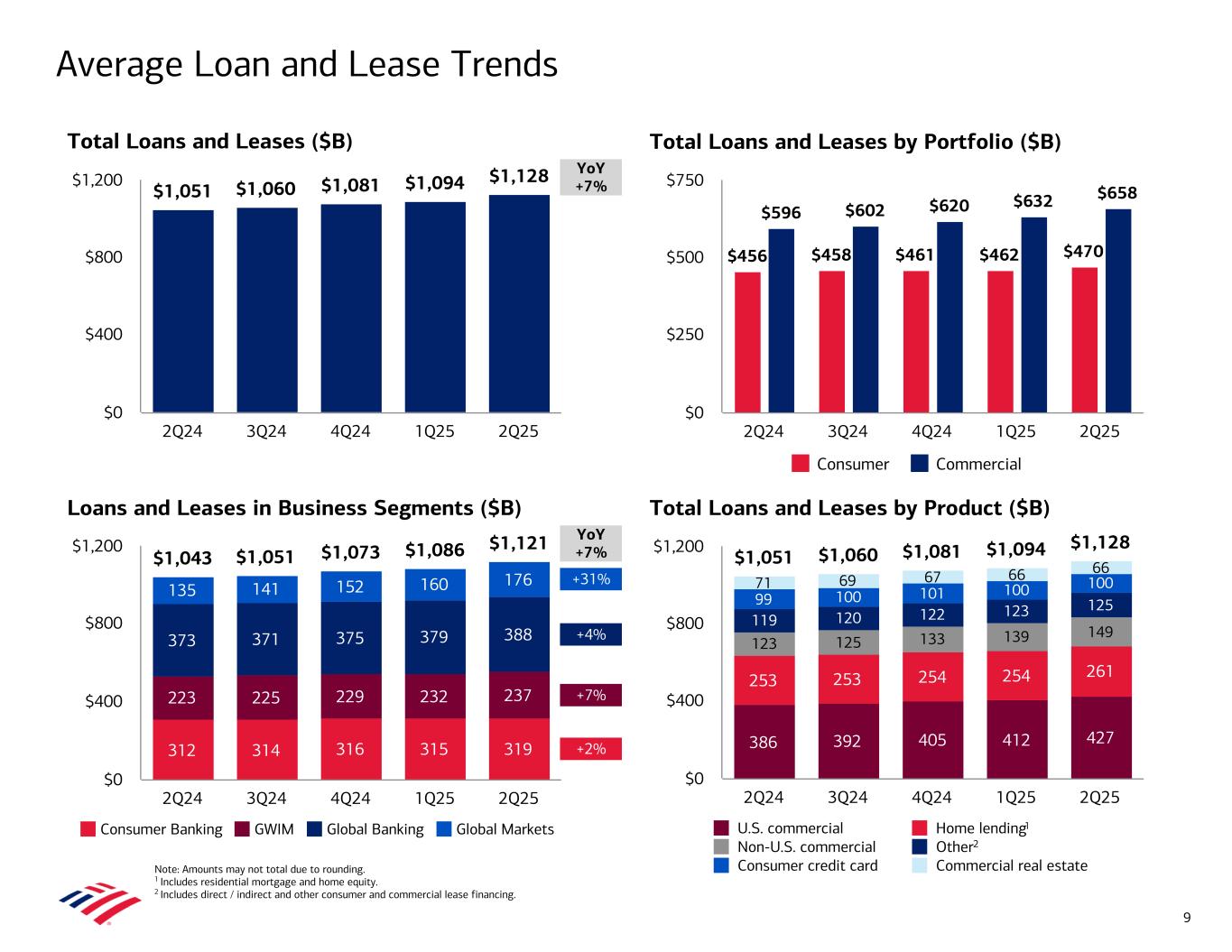 $ 1,043 $ 1,051 $ 1,073 $ 1,086 $ 1,121312312314316315319223225229232237373371375379388135141152160176个人银行业务GWIM Global Banking Global Markets 2Q24 3Q24 4Q24 1Q25 2Q25 $ 0 $ 400 $ 800 $ 1,200 $ 1,051 $ 1,060 $ 1,081 $ 1,094 $ 1,128 2Q24 3Q24 4Q24 1Q25 2Q25 $ 0 $ 400 $ 800 $ 1,200 + 2% + 7% + 4% + 31%平均贷款和租赁趋势YoY + 7% YoY + 7%注:由于四舍五入,金额可能不合计。1包括住宅抵押贷款和房屋净值。2包括直接/间接和其他消费和商业租赁融资。按产品分列的贷款和租赁总额($ B)业务部门的贷款和租赁总额($ B)按投资组合分列的贷款和租赁总额($ B)贷款总额和租赁($ B)$ 456 $ 458 $ 461 $ 462 $ 470 $ 596 $ 602 $ 620 $ 632 $ 658消费商业2Q24 3Q24 4Q24 1Q25 2Q25 $ 0 $ 250 $ 500 $ 7509 $ 1,051 $ 1,060 $ 1,081 $ 1,094 $ 1,12838639240541242725325425426112312513313914911912012122123125991001011001007169676666美国商业房屋贷款非美国商业其他消费信用卡商业房地产2Q24 3Q24 4Q24 1Q25 2Q25 $ 0 $ 400 $ 800 $ 1,20021