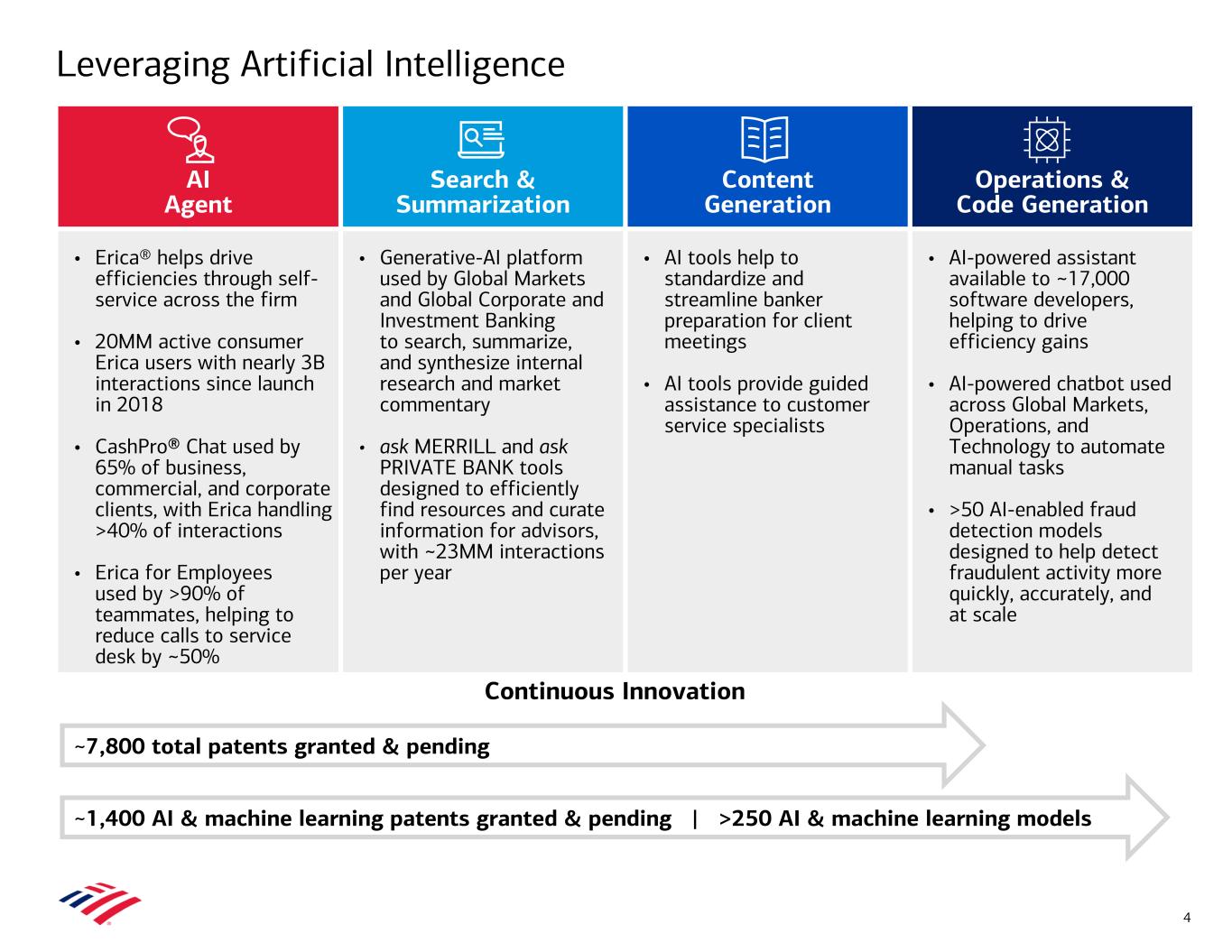 AI代理搜索&汇总内容生成运营&代码生成• Erica®通过全公司的自助服务帮助提高效率• 20mm活跃消费者Erica用户自2018年推出以来互动近3B • CashPro®65%的商业、商业和企业客户使用Chat,Erica处理> 40%的交互• Erica for Employees被> 90%的队友使用,帮助减少对服务台的呼叫约50% • Generative-AI平台被Global Markets和Global Corporate and Investment Banking用于搜索、总结、并综合内部研究和市场评论•询问美林和询问私人银行工具,旨在有效地为顾问寻找资源和管理信息,每年有约23mm的互动•人工智能工具帮助标准化和简化银行家为客户会议做准备•人工智能工具为客户服务专家提供指导性帮助•约17,000名软件开发人员可以使用人工智能驱动的助手,帮助推动效率提升•全球市场、运营和技术领域使用人工智能驱动的聊天机器人,以自动化手动任务• > 50个支持人工智能的欺诈检测模型,旨在帮助更快、更准确地检测欺诈活动,并在规模上~7800项已获授权和正在申请的专利利用人工智能4~1400项AI &机器学习专利已获授权和正在申请中| > 250项AI &机器学习模型持续创新