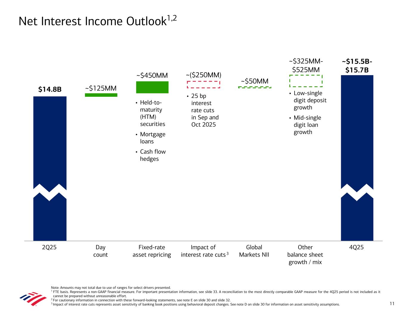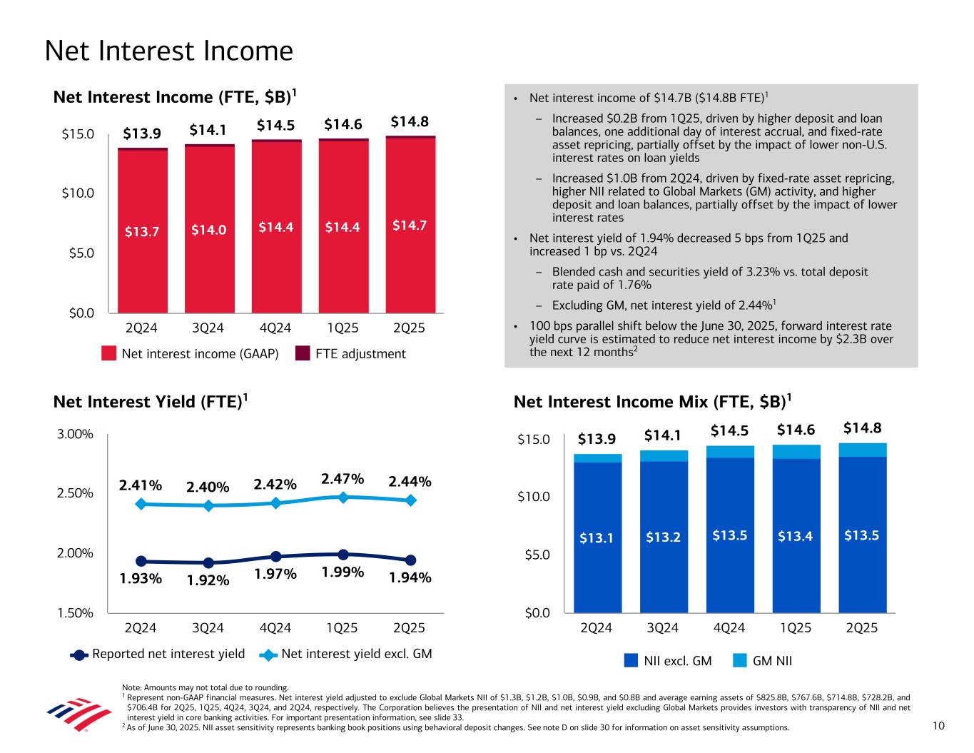 •净利息收入$ 14.7B($ 14.8B FTE)1 –较25年第一季度增加$ 0.2B,受更高的存贷款余额、额外一天的应计利息和固定利率资产重新定价的推动,部分被非美国利率下降对贷款收益率的影响所抵消–较24年第二季度增加$ 1.0B,受固定利率资产重新定价、与全球市场(GM)活动相关的更高NII以及更高的存贷款余额的推动,部分被利率下降的影响所抵销•净利息收益率为1.94%,较第一季度下降5个基点,较第二季度上升1个基点24 –混合现金和证券收益率为3.23%,而支付的总存款利率为1.76% –不包括通用汽车,净利息收益率为2.44% 1 • 100个基点平行移动低于2025年6月30日,远期利率收益率曲线估计将在未来12个月内减少净利息收入$ 2.3B 2净利息收入(FTE,$ B)1净利息收入净利息收益率(FTE)1注:由于四舍五入,金额可能不合计。1代表非GAAP财务指标。调整后的净利息收益率不包括2Q25、1Q25、4Q24、3Q24和2Q24分别为$ 1.3B、$ 1.2B、$ 1.0B、$ 0.9B和$ 0.8B的Global Markets NII和$ 825.8b、$ 767.6b、$ 714.8b、$ 728.2B和$ 706.4b的平均收益资产。该公司认为,NII和净利息收益率(不包括全球市场)的表述为投资者提供了核心银行活动NII和净利息收益率的透明度。有关重要的演示信息,请参见幻灯片33。2截至2025年6月30日。NII资产敏感性表示使用行为存款变化的银行账面头寸。有关资产敏感性假设的信息,请参见幻灯片30的附注D。1.93% 1.92% 1.97% 1.99% 1.94% 2.41% 2.40% 2.42% 2.47% 2.44%报告净利息收益率不包括净利息收益率GM 2Q24 3Q24 4Q24 1Q25 2Q25 1.50% 2.00% 2.50% 3.00% $ 13.9 $ 14.1 $ 14.5 $ 14.6 $ 14.8 $ 13.7 $ 14.0 $ 14.4 $ 14.7净利息收入(GAAP)FTE调整2Q24 3Q24 4Q24 1Q25 2Q25 $ 0.0 $ 5.0 $ 10.0 $ 15.0 10净利息收入组合(FTE,$ B)1 $ 13.9 $ 14.1 $ 14.5 $ 14.6 $ 14.8 $ 13.1 $ 13.2 $ 13.5 $ 13.4 $ 13.5 NII excl。GM GM NII 2Q24 3Q24 4Q24 1Q25 2Q25 $ 0.0 $ 5.0 $ 10.0 $ 15.0