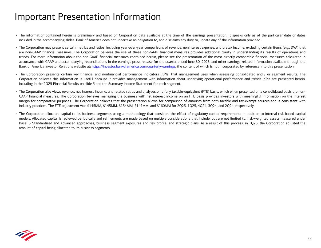 重要演示信息33 •此处包含的信息是初步的,基于收益演示时可获得的公司数据。它仅代表随附幻灯片中包含的特定日期或日期。美国银行不承担更新所提供的任何信息的义务,也不承担任何义务。•公司可能会提供某些指标和比率,包括收入、非利息费用和税前收入的同比比较,但不包括属于非公认会计准则财务指标的某些项目(例如DVA)。该公司认为,使用这些非公认会计准则财务指标为理解其运营结果和趋势提供了额外的清晰度。有关此处包含的非GAAP财务指标的更多信息,请参阅截至2025年6月30日的季度收益新闻稿中根据GAAP计算的最直接可比的财务指标以及随附的对账的介绍,以及可通过美国银行投资者关系网站获取的其他收益相关信息:https://investor.bankofamerica.com/quarterly-earnings,其内容未通过引用方式并入本演示文稿。•公司提出管理层在评估合并和/或分部业绩时使用的某些关键财务和非财务业绩指标(KPI)。该公司认为这些信息是有用的,因为它为管理层提供了有关基本运营绩效和趋势的信息。KPI在此展示,包括在幻灯片5上的2Q25财务业绩和每个分部的简表损益表中。•该公司还在完全应税等值(FTE)基础上查看收入、净利息收入以及相关比率和分析,这些在合并基础上列报时属于非公认会计准则财务指标。该公司认为,在FTE基础上以净利息收入管理业务可为投资者提供有关息差的有意义的信息,以用于比较目的。该公司认为,该列报方式允许对应税和免税来源的金额进行比较,并且符合行业惯例。2Q25、1Q25、4Q24、3Q24、2Q24 FTE调整分别为$ 145mm、$ 145mm、$ 154mm、$ 147mm、$ 160mm。•公司使用一种方法向其业务部门分配资本,该方法除了考虑内部基于风险的资本模型外,还考虑了监管资本要求的影响。分配的资本定期进行审查,并基于多重考虑进行细化,这些考虑包括但不限于根据巴塞尔协议3标准化和高级方法计量的风险加权资产、业务部门风险敞口和风险状况以及战略计划。作为这一过程的结果,在25年第一季度,公司调整了分配给其业务部门的资本金额。