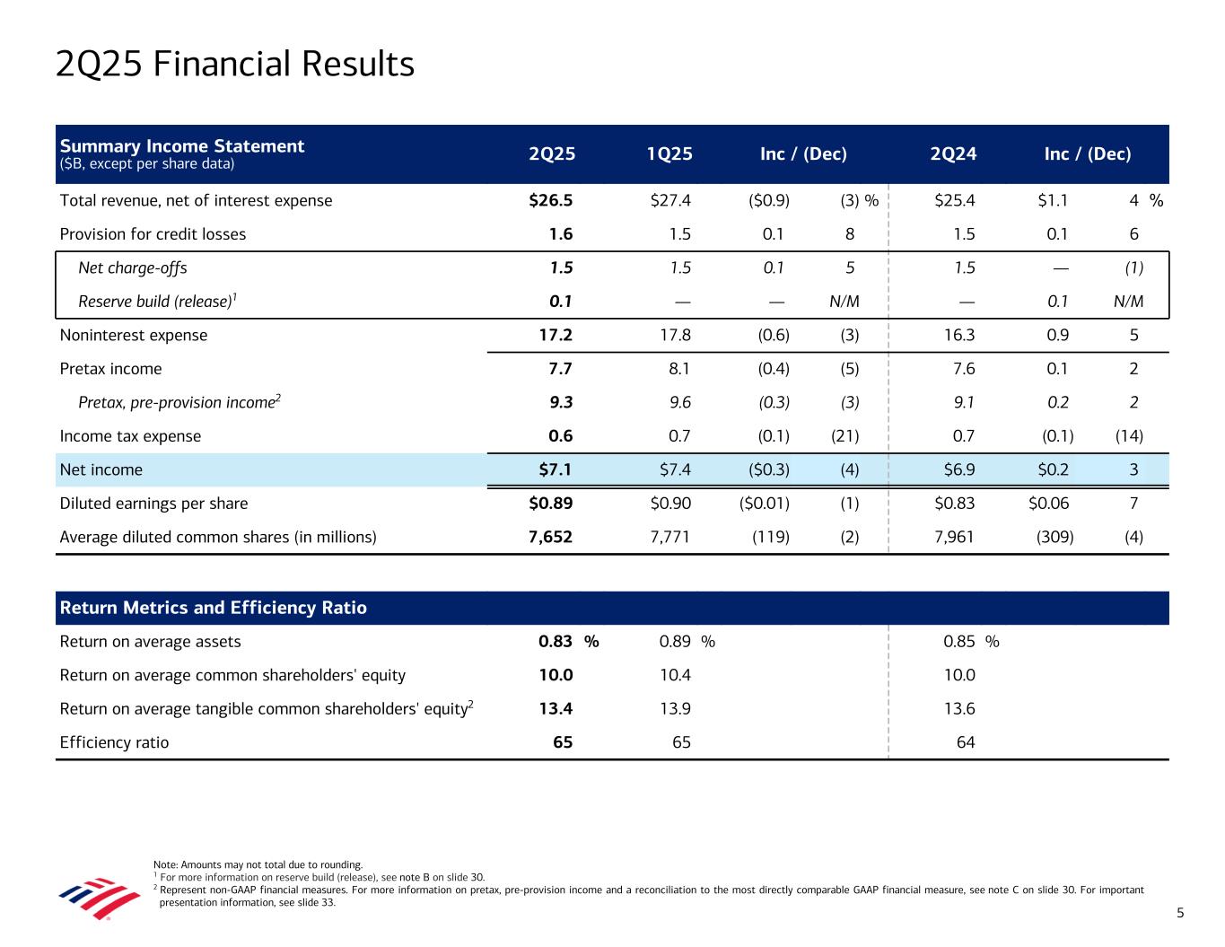 注:ROE代表平均普通股股东权益回报率。ROTCE代表平均有形普通股股东权益回报率。ROA代表平均资产回报率。1收入,扣除利息费用。2稀释每股收益。3期末(EOP)。4 CET1代表普通股权一级资本。2025年6月30日的CET1比率是初步的。5 GLS代表平均全球流动性来源。有关全球流动性来源的定义,请参见幻灯片30上的注释A。6代表非GAAP财务指标。有关重要的演示信息,请参见幻灯片33。2Q25亮点2盈利增长资产负债表持续强劲健康回报收入$ 26.5b1 + 4% YoY净收入$ 7.1b + 3% YoY EPS $ 0.892 + 7% YoY存款$ 2.0T3 + 5% YoY CET1 11.5%远高于reg. min.4稳健流动性GLS $ 938b5 ROE10.0 % ROTCE 13.4% 6 ROA0.83 %