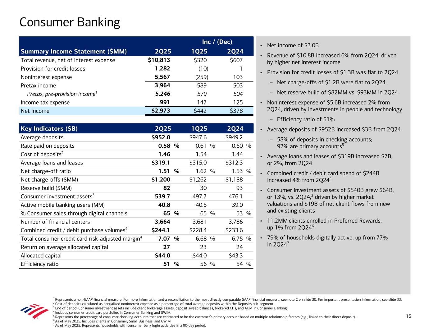 •净收入$ 3.0B •收入$ 10.8B较2Q24增长6%,受净利息收入增加推动•信贷损失拨备$ 1.3B与2Q24持平–净冲销$ 1.2B与2Q24持平–净储备增加$ 82mm,而2Q24为$ 93mm •非利息支出$ 5.6B较2Q24增长2%,受人员和技术投资推动–效率比51% •平均存款$ 952B较2Q24增加$ 3B – 58%的支票账户存款;92%为主要账户5 •平均贷款和租赁$ 319B增加$ 7B,或2%,自2Q24起•信用卡/借记卡综合支出为$ 244B,较2Q244增长4% •消费者投资资产为$ 540B,较2Q24增长$ 64B,或13%,3受市场估值上升和新老客户净客户流量$ 19B推动• 11.2mm客户注册了Preferred Rewards,较2Q246增长1% • 79%的家庭数字活跃,高于2Q247的77%个人银行业务1代表非公认会计准则财务指标。有关更多信息以及与最直接可比的GAAP财务指标的对账,请参见幻灯片30的附注C。有关重要的演示信息,请参见幻灯片33。2存款成本计算为年化非利息费用占Deposits子版块内平均存款总额的百分比。3期末。消费投资资产包括客户经纪资产、存款扫描余额、经纪CD、消费者银行业务中的AUM。4包括消费者银行和GWIM中的消费者信用卡组合。5表示根据多种关系因素(例如,与其直接存款挂钩)估计为客户主要账户的消费者支票账户的百分比。6截至2025年5月。包括消费者、小型企业和GWIM的客户。7截至2025年5月。表示90天内有消费者银行登录活动的家庭。Inc/(12月)损益表摘要(百万美元)2Q25 1Q25 2Q24总收入,扣除利息费用$ 10,813 $ 320 $ 607信贷损失准备金1,282(10)1非利息费用5,567(259)103税前收入3,964589503税前,拨备前收入15,246579504所得税费用991147125净收入$ 2,973 $ 442 $ 378关键指标($ B)2Q25 1Q25 2Q24平均存款$ 952.0 $ 947.6 $ 949.2存款付息率0.58% 0.61% 0.60%存款成本21.46 1.54 1.44平均贷款和租赁$ 319.1 $ 315.0 $ 312.3净冲销率1.51% 1.62% 1.53%净冲销率($ MM)$ 1,200 $ 1,262 $ 1,188 Reserve build($ MM)823093消费者投资资产3539.74 97.7 476.1移动银行活跃用户(MM)40.84 0.53 9.0%数字渠道的消费者销售65% 65% 53%金融中心数量3,6643,6813,786综合贷记/借记购买量4 $ 244.1 $ 228.4 $ 233.6消费者信用卡风险调整后总利润率47.07% 6.68% 6.75%平均分配资本回报率272324分配资本$ 44.0 $ 44.0 $ 43.3效率比51% 56% 54% 15