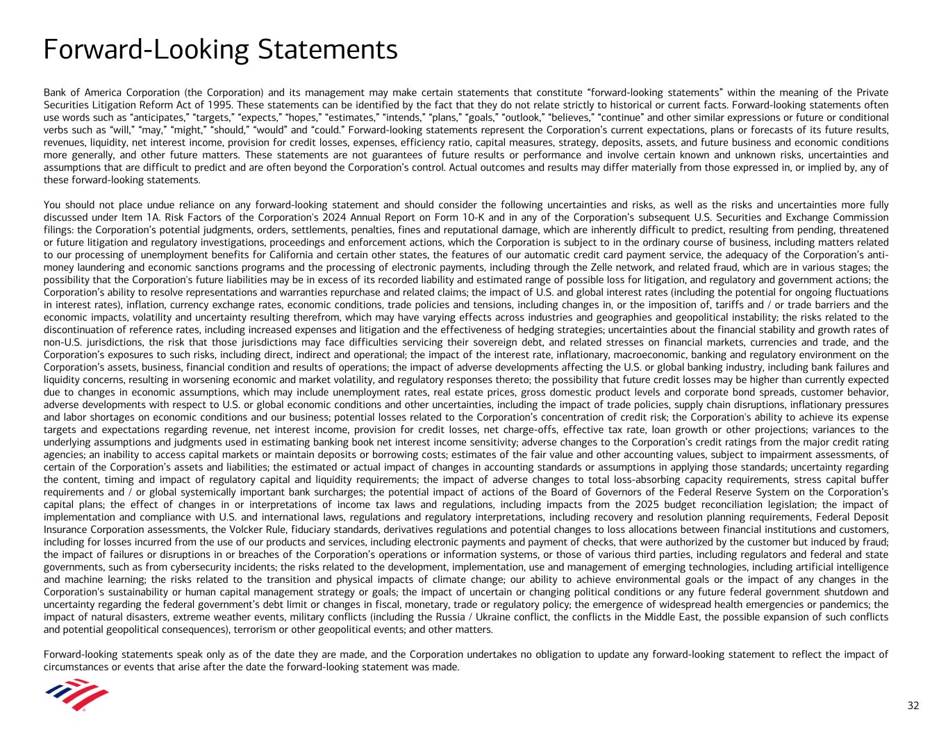 前瞻性陈述美国银行(Bank of America Corporation)(the Corporation)及其管理层可能会做出某些构成1995年《私人证券诉讼改革法案》含义内的“前瞻性陈述”的陈述。这些陈述可以通过它们与历史或当前事实并不严格相关这一事实来识别。前瞻性陈述经常使用诸如“预期”、“目标”、“预期”、“希望”、“估计”、“打算”、“计划”、“目标”、“展望”、“相信”、“继续”等词语,以及其他类似的表达方式或未来或条件动词,如“将”、“可能”、“可能”、“应该”、“将”和“可以”。前瞻性陈述代表公司当前对其未来业绩、收入、流动性、净利息收入、信贷损失准备金、费用、效率比率、资本措施、战略、存款、资产、更广泛的未来商业和经济状况以及其他未来事项的预期、计划或预测。这些陈述不是对未来结果或业绩的保证,涉及某些已知和未知的风险、不确定性和假设,这些风险、不确定性和假设难以预测,通常超出公司的控制范围。实际结果和结果可能与任何这些前瞻性陈述中表达或暗示的内容存在重大差异。您不应过分依赖任何前瞻性陈述,应考虑以下不确定性和风险,以及项目1a下更充分讨论的风险和不确定性。公司2024年年度报告的10-K表格和公司随后提交给美国证券交易委员会的任何文件中的风险因素:公司的潜在判决、命令、和解、处罚、罚款和声誉损害,这些因素本质上是难以预测的,由公司在日常业务过程中受到的未决、威胁或未来诉讼和监管调查、诉讼和强制执行行动,包括与我们为加利福尼亚州和某些其他州处理失业救济金有关的事项,我们的信用卡自动支付服务的功能,公司的反洗钱和经济制裁计划以及处理电子支付(包括通过Zelle网络)和相关欺诈行为的充分性,这些都处于不同阶段;公司未来负债可能超过其记录的负债和估计的诉讼可能损失范围的可能性,以及监管和政府行动;公司解决陈述和担保回购和相关索赔的能力;美国和全球利率的影响(包括利率持续波动的可能性)、通货膨胀、货币汇率、经济状况、贸易政策和紧张局势,包括关税和/或贸易壁垒的变化或实施以及由此产生的经济影响、波动性和不确定性,这可能会对不同行业和地区产生不同影响以及地缘政治不稳定;与停止参考利率相关的风险,包括增加的费用和诉讼以及对冲策略的有效性;非美国司法管辖区的金融稳定性和增长率的不确定性,这些司法管辖区可能面临难以偿还其主权债务的风险,以及金融市场、货币和贸易面临的相关压力,以及公司面临的此类风险敞口,包括直接、间接的和可操作的;利率、通货膨胀、宏观经济、银行业和监管环境对公司资产、业务、财务状况和经营业绩的影响;影响美国或全球银行业的不利发展的影响,包括银行倒闭和流动性担忧,导致经济和市场波动恶化,以及监管机构对此的反应;由于经济假设的变化,未来信贷损失可能高于目前预期的可能性,其中可能包括失业率、房地产价格、国内生产总值水平和公司债券利差、客户行为,与美国或全球经济状况和其他不确定性有关的不利发展,包括贸易政策、供应链中断、通胀压力和劳动力短缺对经济状况和我们的业务的影响;与公司信用风险集中相关的潜在损失;公司实现有关收入、净利息收入、信用损失准备金、净冲销、有效税率的费用目标和预期的能力, 贷款增长或其他预测;用于估计银行账面净利息收入敏感性的基本假设和判断的差异;主要信用评级机构对公司信用评级的不利变化;无法进入资本市场或维持存款或借款成本;对公司某些资产和负债的公允价值和其他会计价值的估计,但须经减值评估;在应用这些准则时会计准则或假设变化的估计或实际影响;内容的不确定性,监管资本和流动性要求的时间安排和影响;总损失吸收能力要求、压力资本缓冲要求和/或全球系统重要性银行附加费的不利变化的影响;联邦储备系统理事会的行动对公司资本计划的潜在影响;所得税法律法规的变化或解释的影响,包括2025年预算调节立法的影响;实施和遵守美国和国际法律、法规和监管解释的影响,包括恢复和解决规划要求,联邦存款保险公司评估,沃尔克规则、信托标准、衍生品法规以及金融机构与客户之间损失分配的潜在变化,包括因使用我们的产品和服务(包括电子支付和支票支付)而产生的损失,这些损失是客户授权但由欺诈引起的;公司运营或信息系统或包括监管机构、联邦和州政府在内的各种第三方的运营或信息系统出现故障或中断或遭到破坏的影响,例如网络安全事件;与新兴技术的开发、实施、使用和管理相关的风险,包括人工智能和机器学习;与气候变化的过渡和物理影响相关的风险;我们实现环境目标的能力或公司可持续性或人力资本管理战略或目标的任何变化的影响;不确定或不断变化的政治条件或任何未来联邦政府关闭的影响以及与联邦政府债务限额或财政、货币、贸易或监管政策变化有关的不确定性;出现广泛的卫生紧急情况或流行病;自然灾害、极端天气事件、军事冲突(包括俄罗斯/乌克兰冲突,中东冲突、此类冲突可能扩大及潜在地缘政治后果)、恐怖主义或其他地缘政治事件;以及其他事项。前瞻性陈述仅在作出之日起生效,公司不承担更新任何前瞻性陈述以反映前瞻性陈述作出之日后出现的情况或事件的影响的义务。32