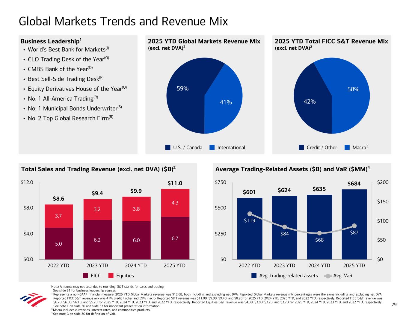 注:由于四舍五入,金额可能不相加。S & T代表销售和交易。1有关业务领导来源,请参见幻灯片31。2代表非GAAP财务指标。2025年初至今Global Markets的收入为$ 12.6B,包括和不包括净DVA。报告的全球市场收入组合百分比相同,包括和不包括净DVA。报告的FICC S & T收入组合为41%的信贷/其他和59%的宏观。2025年初至今、2024年初至今、2023年初至今和2022年初至今,报告的科技收入分别为$ 11.0B、$ 9.8B、$ 9.4B和$ 8.9B。报告的FICC S & T收入在2025年年初至今、2024年年初至今、2023年年初至今和2022年年初至今分别为$ 6.7B、$ 6.0B、$ 6.1B和$ 5.2B。报告的股票科技收入在2025年年初至今、2024年年初至今、2023年年初至今和2022年年初至今分别为$ 4.3B、$ 3.8B、$ 3.2B和$ 3.7B。有关重要的演示信息,请参见幻灯片30和幻灯片33上的注释F。3宏观包括货币、利率、商品品。4 VaR的定义见幻灯片30的注释G。全球市场趋势和收入组合2025年初至今全球市场收入组合(不包括净DVA)2业务领导1 •全球市场最佳银行(J)•年度CLO交易台(O)•年度CMBS银行(O)•最佳卖方交易台(P)•年度股票衍生品之家(Q)•排名第一的全美交易(R)•排名第一的市政债券承销商(S)•排名第二的顶级全球研究公司(R)2025年初至今FICC S & T总收入组合(不包括净TERM0)2总销售和交易收入(不包括净TERM0DVA)($ B)2平均交易相关资产($ B)和风险价值($ mm)4 $ 8.6 $ 9.4 $ 9.9 $ 11.05.06.26.06.7 3.7 3.2 3.84.3 FICC Equities 2022 YTD 2023 YTD 2024 YTD 2025 YTD $ 0.0 $ 4.0 $ 8.0 $ 12.0 $ 601 $ 624 $ 624 $ 635 $ 684 $ 119 $ 84 $ 68 $ 87平均交易相关资产VAR2022 YTD2023 YTD2024 YTD2025 YTD0 $ 250 $ 500 $ 750 $ 0 $ 50 $ 100 $ 150 $ 20059% 41%美国/加拿大国际42% 58%信贷/其他宏观293