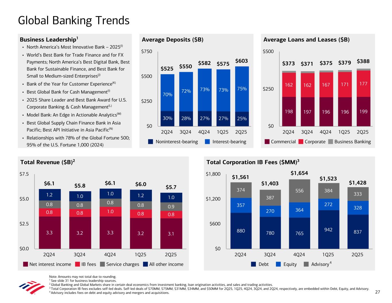 全球银行业趋势注:由于四舍五入,金额可能不相加。1有关业务领导来源,请参见幻灯片31。2 Global Banking and Global Markets share in certain deal economics from investment banking,loan origination activities,and sales and trading activities。3 Total Corporation IB费用不包括自行主导的交易。2Q25、1Q25、4Q24、3Q24和2Q24分别为70mm、75mm、31mm、34mm和50mm美元的自行主导交易嵌入债务、股权和咨询中。4咨询包括债务和股权咨询以及并购的费用。平均存款($ B)业务领导地位1 •北美最具创新力的银行– 2025(i)•全球最佳贸易融资和外汇支付银行;北美最佳数字银行、最佳可持续金融银行,和中小企业最佳银行(J)•客户体验年度银行(K)•现金管理最佳全球银行(I)• 2025年美国企业银行和现金管理股票领导者和最佳银行奖(L)•示范银行:可操作分析的优势(M)•亚太地区最佳全球供应链金融银行;亚太地区最佳API倡议(N)•与78%的全球财富500强企业的关系;95%的美国财富1000强企业(2024年)平均贷款和租赁($ B)总收入($ B)2总公司IB费用($ MM)3 $ 6.1 $ 5.8 $ 6.1 $ 6.0 $ 5.7 3.3 3.2 3.3 3.2 3.1 0.8 0.8 1.0 0.8 0.8 0.8 0.8 0.8 0.8 0.8 0.8 0.9 1.2 1.0 1.0 1.2 1.0净利息收入IB费用服务费所有其他收入2Q24 3Q24 4Q24 1Q25 2Q25 $ 0.0 $ 2.5 $ 5.0 $ 7.5880780765942837357270364272328374387556384333 $ 1,561 $ 1,403 $ 1,654 $ 1,523 $ 1,428债务权益咨询2Q24 3Q24 4Q24 1Q25 2Q25 $ 0 $ 600 $ 1,200 $ 1,800198197196196199162162167171177 $ 373 $ 371 $ 375$ 379 $ 388商业公司商业银行业务2Q24 3Q24 4Q24 1Q25 2Q25 $ 0 $ 250 $ 5004 $ 525 $ 550 $ 582 $ 575 $ 603不计息有息2Q24 3Q24 4Q24 1Q25 2Q25 $ 0 $ 250 $ 500 $ 7502730% 28% 27% 27% 25% 70% 72% 73% 75%