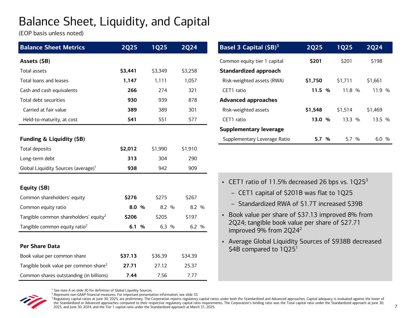 资产负债表指标2Q25 1Q25 2Q24 Basel 3 Capital($ B)3 2Q25 1Q25 2Q24 Assets($ B)Common equity tier 1 capital $ 201 $ 201 $ 198 Total assets $ 3,441 $ 3,349 $ 3,258 Standardized approach total loans and leases 1,1471,1111,057 RWA)$ 1,750 $ 1,711 $ 1,661 cash and cash equivalents 266274321 CET1 ratio 11.5% 11.8% 11.9% Total debt securities 930939878 Advanced approach carried at fair value 389389301 Risk weighted assets $ 1,548 $ 1,514 $ 1按成本541551 577 CET1比率13.0% 13.3% 13.5%补充杠杆融资和流动性($ B)补充杠杆率5.7% 6.0%存款总额$ 2,0 12 $ 1,990 $ 1,910长期债务313304290全球流动性来源(平均)1938942909权益($ B)普通股股东权益$ 276 $ 275 $ 267普通股权益比率8.0% 8.2%有形普通股股东权益2 $ 206 $ 205 $ 197有形普通股权益比率26.1% 6.3% 6.2%每股数据每股普通股账面价值$ 37.13 $ 36.39 $ 34.39每股普通股有形账面价值227.7 127.12 25.37普通股流通股(十亿)7.4 47.56 7.771全球流动性来源的定义见幻灯片30注A。2代表非GAAP财务指标。有关重要的演示信息,请参见幻灯片33。3监管资本比率2025年6月30日,初步。该公司在标准化和高级方法下报告监管资本比率。与各自的监管资本比率要求相比,根据标准化或高级方法中的较低者对资本充足率进行评估。公司的约束比率为2025年6月30日、2024年6月30日标准化法下的总资本比率,以及2025年3月31日标准化法下的一级资本比率。资产负债表、流动性和资本(除非另有说明,以EOP为基础)7 • CET1比率为11.5%,与253年第一季度相比下降26个基点– CET1资本为201B美元,与25年第一季度持平–标准化风险加权资产为1.7T美元,增加了39B美元•每股账面价值为37.13美元,与2Q24相比增长8%;每股有形账面价值为27.71美元,与242年第二季度相比增长9% •全球平均流动性来源为938B美元,与251年第一季度相比下降4B美元