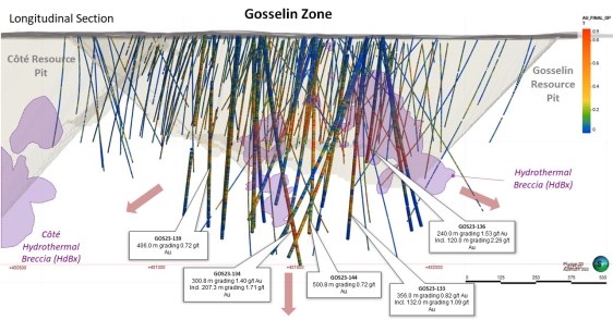 "这一钻石钻探计划的战略目标是深入戈塞林矿床的扩张潜力,特别是在东部和新发现的西部热液角砾岩体之下,这些角砾岩之间的空隙区域,以及沿着该矿床的南部边缘。化验结果证实,含金蚀变和矿化热液角砾岩和伴生英云母岩在前一资源坑壳下方垂直400米处的许多钻孔中相交,延伸了大约一公里的走向长度。结果非常令人鼓舞,表明Gosselin矿床在完成进一步划定钻探后,有可能扩大到与相邻的C ô t é矿床类似的规模。