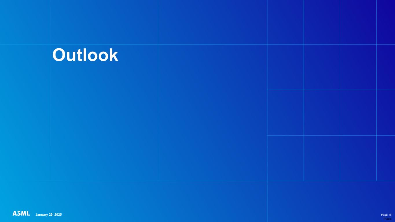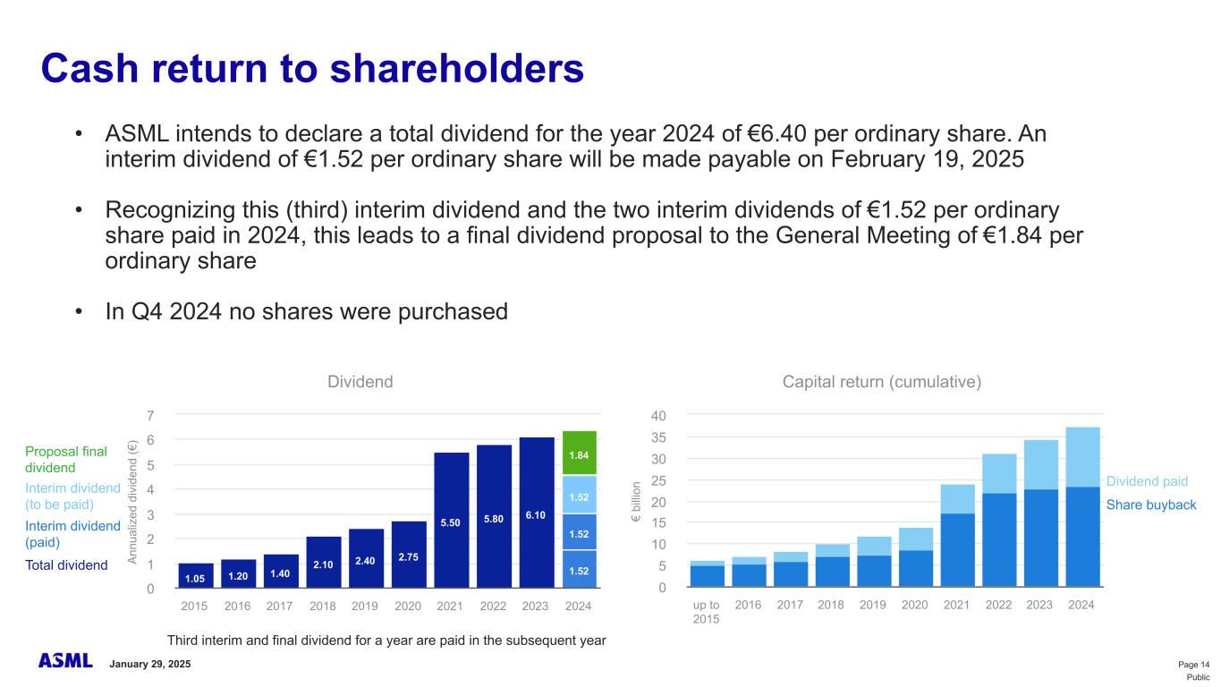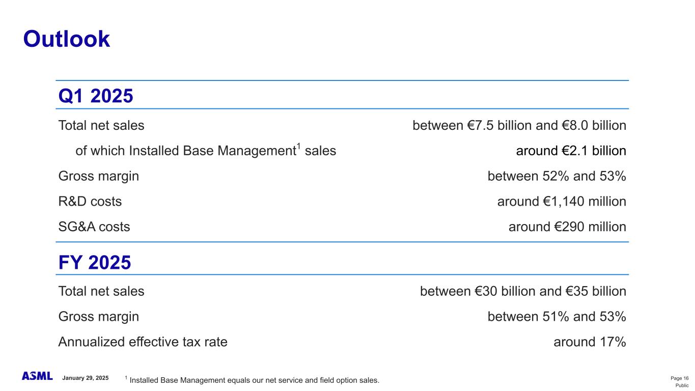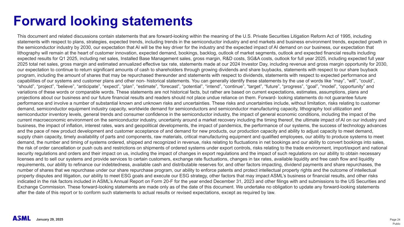 第24页2025年1月29日公开本文件和相关讨论包含1995年美国《私人证券诉讼改革法案》含义内的前瞻性陈述,包括有关计划、战略、预期趋势的陈述,包括半导体行业和终端市场的趋势和商业环境趋势,预计到2030年半导体行业的增长,我们预计人工智能将是行业的关键驱动因素,以及人工智能需求对我们业务的预期影响,我们预计光刻技术将继续处于客户创新、预期需求、预订、积压的核心,细分市场前景、前景和预期财务业绩,包括2025年第一季度的预期业绩,包括净销售额、已安装基地管理销售额、毛利率、研发成本、SG & A成本、2025年全年的前景,包括预计2025年全年的总净销售额、毛利率和估计的年化有效税率、在2024年投资者日发表的声明,包括2030年的收入和毛利率机会、我们预期通过不断增加的股息和股票回购继续向股东返还大量现金、关于我们股票回购计划的声明,包括可能根据该协议回购的股份数量以及与股息有关的报表、与我们的系统和客户计划的预期性能和能力有关的报表以及其他非历史报表。你一般可以通过使用“可能”、“将”、“可以”、“应该”、“项目”、“相信”、“预期”、“计划”、“估计”、“预测”、“潜在”、“打算”、“继续”、“目标”、“未来”、“进展”、“目标”、“机会”等词语来识别这些陈述,以及这些词语或类似词语的变体。这些陈述不是历史事实,而是基于当前对我们业务和未来财务业绩的预期、估计、假设、计划和预测,读者不应过分依赖它们。前瞻性陈述不能保证未来的业绩,并涉及许多重大的已知和未知风险和不确定性。这些风险和不确定性包括但不限于与客户需求、半导体设备行业产能、全球对半导体和半导体制造产能的需求、光刻工具利用率和半导体库存水平、半导体行业的一般趋势和消费者信心、总体经济状况的影响,包括当前宏观经济环境对半导体行业的影响、围绕市场复苏的不确定性,包括复苏的时间、人工智能对我们行业和业务的最终影响、通货膨胀、利率、战争和地缘政治发展的影响、流行病的影响、我们系统的性能,技术进步的成功和新产品开发的速度以及客户对新产品的接受和需求,我们的生产能力和调整能力以满足需求,供应链能力,零部件、原材料、关键制造设备和合格员工的及时可用性,我们生产系统以满足需求的能力,订购、发货和确认收入的系统的数量和时间,与净预订量波动相关的风险以及我们将预订量转化为销售额的能力,订单取消或推出的风险以及出口管制下已订购系统的发货受到限制,与贸易环境、进出口和国家安全法规和订单相关的风险及其对我们的影响,包括出口法规变化的影响以及此类法规对我们获得必要许可证以及向某些客户销售我们的系统和提供服务的能力的影响、汇率波动、税率变化、可用流动性和自由现金流以及流动性要求、我们为债务再融资的能力、可用现金和可分配准备金,以及其他影响因素、股息支付和股份回购、我们根据股份回购计划回购的股份数量、我们执行专利和保护知识产权的能力以及知识产权纠纷和诉讼的结果、我们实现ESG目标和执行ESG战略的能力、可能影响ASML的业务或财务业绩的其他因素,以及TERMA截至12月31日止年度的20-F表格年度报告所载风险因素中指明的其他风险因素, 2023以及向美国证券交易委员会提交的其他文件和提交的文件。这些前瞻性陈述仅在本文件发布之日作出。除法律要求外,我们不承担在本报告发布之日后更新任何前瞻性陈述或使此类陈述符合实际结果或经修订的预期的义务。前瞻性陈述