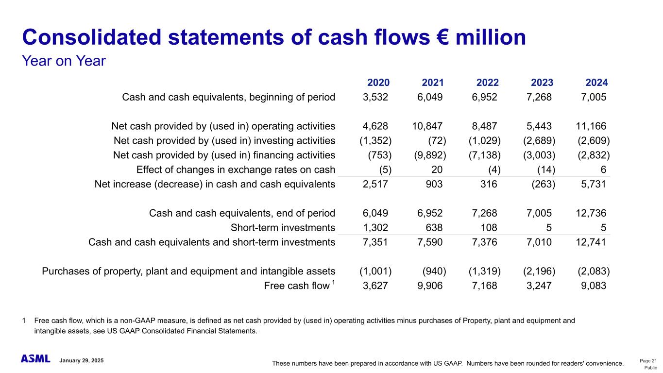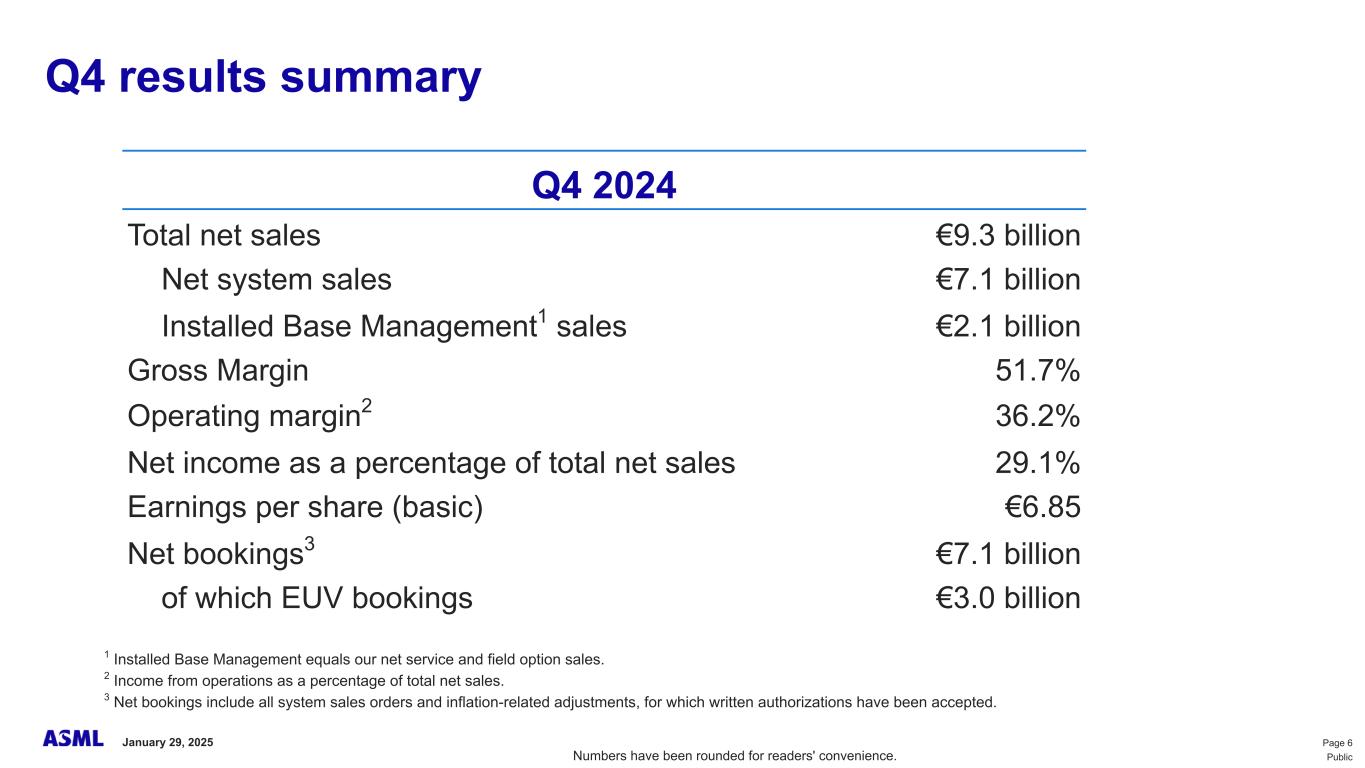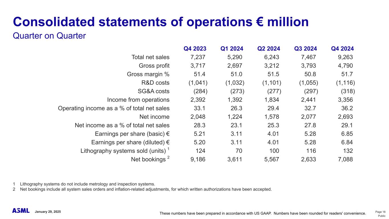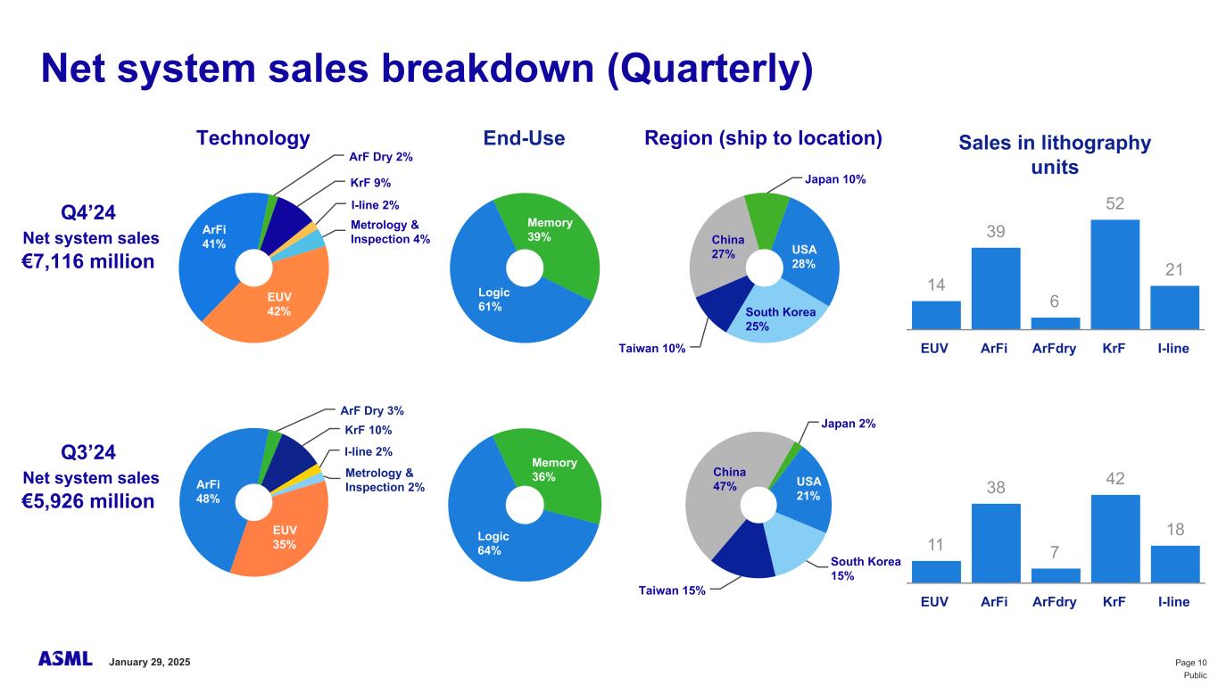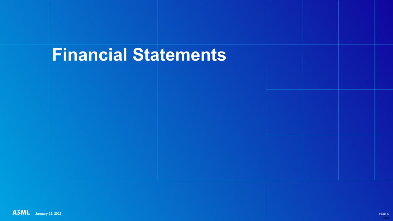 第24页2025年1月29日公开本文件和相关讨论包含1995年美国《私人证券诉讼改革法案》含义内的前瞻性陈述,包括有关计划、战略、预期趋势的陈述,包括半导体行业和终端市场的趋势和商业环境趋势,预计到2030年半导体行业的增长,我们预计人工智能将是行业的关键驱动因素,以及人工智能需求对我们业务的预期影响,我们预计光刻技术将继续处于客户创新、预期需求、预订、积压的核心,细分市场前景、前景和预期财务业绩,包括2025年第一季度的预期业绩,包括净销售额、已安装基地管理销售额、毛利率、研发成本、SG & A成本、2025年全年的前景,包括预计2025年全年的总净销售额、毛利率和估计的年化有效税率、在2024年投资者日发表的声明,包括2030年的收入和毛利率机会、我们预期通过不断增加的股息和股票回购继续向股东返还大量现金、关于我们股票回购计划的声明,包括可能根据该协议回购的股份数量以及与股息有关的报表、与我们的系统和客户计划的预期性能和能力有关的报表以及其他非历史报表。你一般可以通过使用“可能”、“将”、“可以”、“应该”、“项目”、“相信”、“预期”、“计划”、“估计”、“预测”、“潜在”、“打算”、“继续”、“目标”、“未来”、“进展”、“目标”、“机会”等词语来识别这些陈述,以及这些词语或类似词语的变体。这些陈述不是历史事实,而是基于当前对我们业务和未来财务业绩的预期、估计、假设、计划和预测,读者不应过分依赖它们。前瞻性陈述不能保证未来的业绩,并涉及许多重大的已知和未知风险和不确定性。这些风险和不确定性包括但不限于与客户需求、半导体设备行业产能、全球对半导体和半导体制造产能的需求、光刻工具利用率和半导体库存水平、半导体行业的一般趋势和消费者信心、总体经济状况的影响,包括当前宏观经济环境对半导体行业的影响、围绕市场复苏的不确定性,包括复苏的时间、人工智能对我们行业和业务的最终影响、通货膨胀、利率、战争和地缘政治发展的影响、流行病的影响、我们系统的性能,技术进步的成功和新产品开发的速度以及客户对新产品的接受和需求,我们的生产能力和调整能力以满足需求,供应链能力,零部件、原材料、关键制造设备和合格员工的及时可用性,我们生产系统以满足需求的能力,订购、发货和确认收入的系统的数量和时间,与净预订量波动相关的风险以及我们将预订量转化为销售额的能力,订单取消或推出的风险以及出口管制下已订购系统的发货受到限制,与贸易环境、进出口和国家安全法规和订单相关的风险及其对我们的影响,包括出口法规变化的影响以及此类法规对我们获得必要许可证以及向某些客户销售我们的系统和提供服务的能力的影响、汇率波动、税率变化、可用流动性和自由现金流以及流动性要求、我们为债务再融资的能力、可用现金和可分配准备金,以及其他影响因素、股息支付和股份回购、我们根据股份回购计划回购的股份数量、我们执行专利和保护知识产权的能力以及知识产权纠纷和诉讼的结果、我们实现ESG目标和执行ESG战略的能力、可能影响ASML的业务或财务业绩的其他因素,以及TERMA截至12月31日止年度的20-F表格年度报告所载风险因素中指明的其他风险因素, 2023以及向美国证券交易委员会提交的其他文件和提交的文件。这些前瞻性陈述仅在本文件发布之日作出。除法律要求外,我们不承担在本报告发布之日后更新任何前瞻性陈述或使此类陈述符合实际结果或经修订的预期的义务。前瞻性陈述