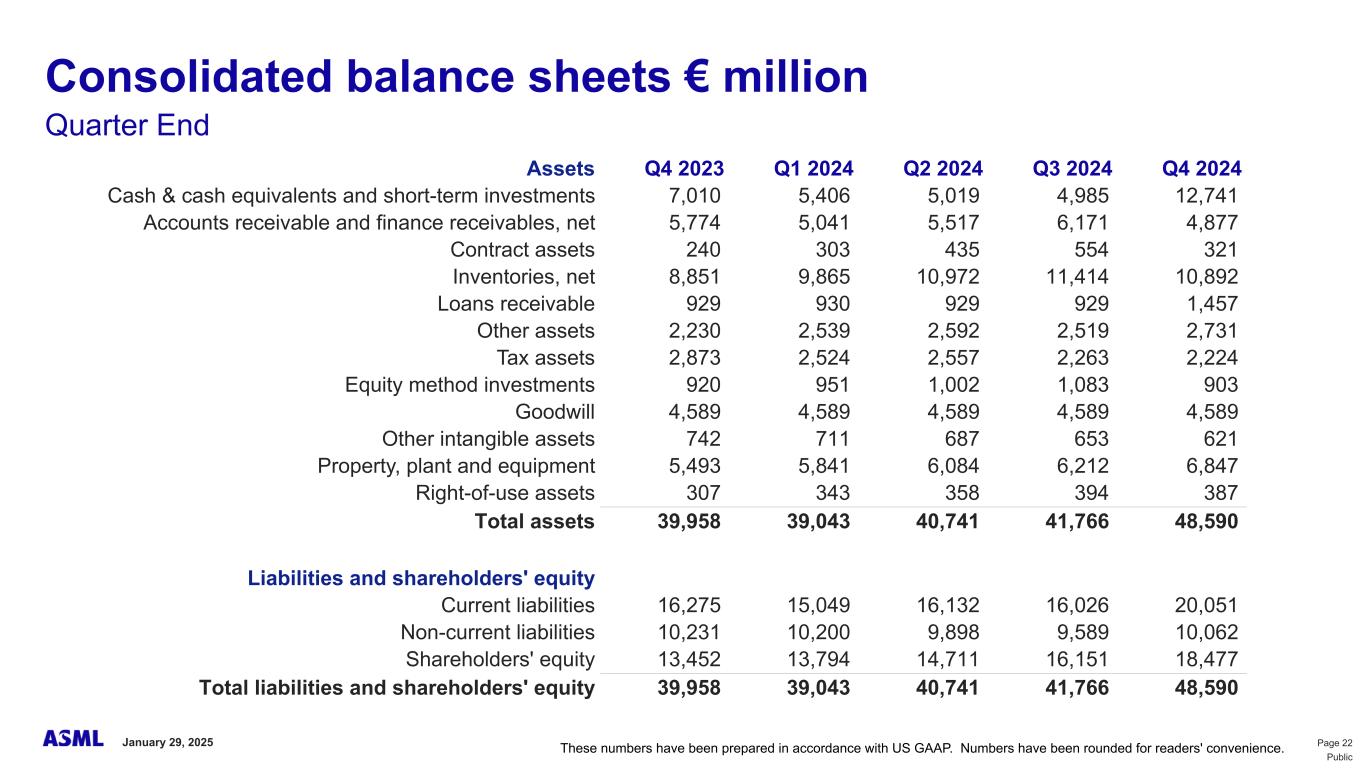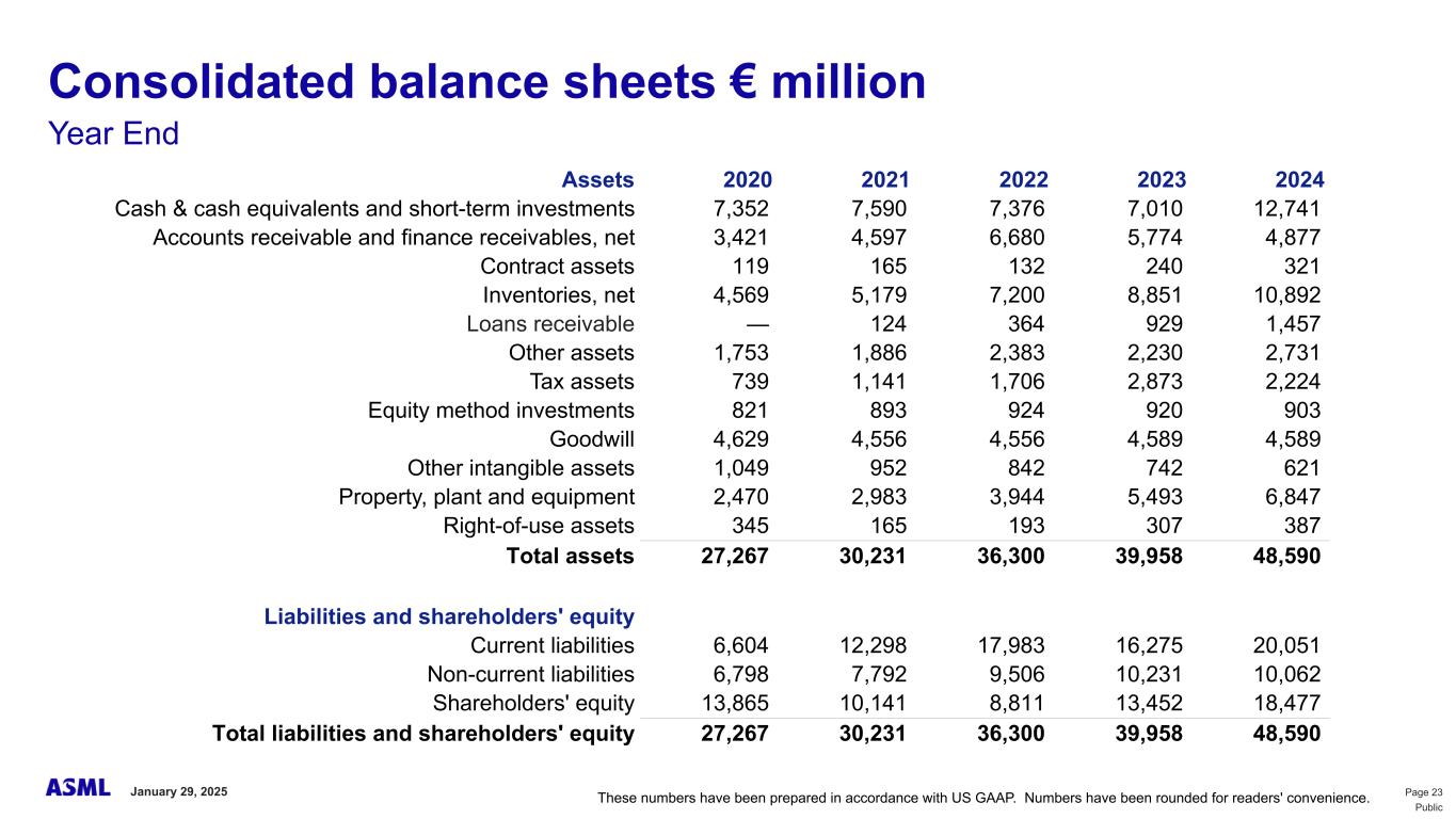 22January 29,2025 Public consolidated balance sheets EUN million quarter-end assets Q4 2023 Q1 2024 Q2 2024 Q3 2024 Q4 2024 cash & cash equivalents and short-term investments 7,0105,4065,0194,98512,741 accounts receivable and financial receivables,net 5,7745,0415,5176,1714,877 contract assets 240净额8,8519,86510,97211,41410,892应收贷款9 299309299291,457其他资产2,2302,5392,5922,5192,731税收资产2,8732,5242,5572,2632,224权益法投资9209511,0021,083903商誉4,5894,5894,5894,5894,589其他无形资产742711687653621财产,厂房及设备5,4935,8416,0846,2126,847使用权资产307343358394387总资产39,95839,04340,74141,76648,590负债和股东权益流动负债16,27515,04916,13216,02620,051非流动负债10,23110,2009,8989,58910,062股东权益13,45213,79414,71116,15118,477总负债和股东权益39,95839,04340,74141,76648,590这些数字是按照美国公认会计原则编制的。为方便读者阅读,数字已四舍五入。