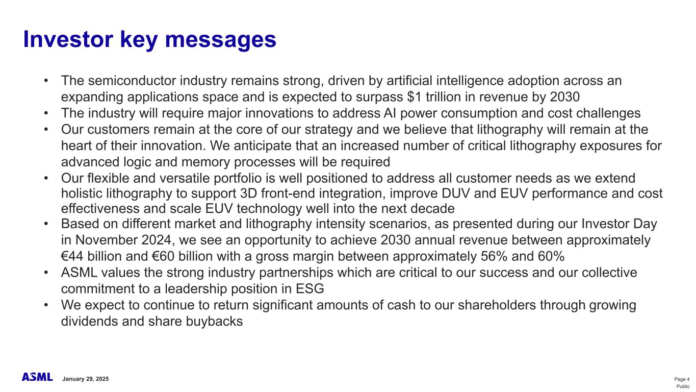 第4页2025年1月29日公众投资者关键信息•半导体行业在不断扩大的应用领域采用人工智能的推动下保持强劲,预计到2030年收入将超过1万亿美元•该行业将需要重大创新来应对AI功耗和成本挑战•我们的客户仍然是我们战略的核心,我们相信光刻技术仍将是他们创新的核心。我们预计,将需要更多用于先进逻辑和内存工艺的关键光刻曝光•我们灵活且多功能的产品组合能够很好地满足所有客户需求,因为我们将整体光刻扩展到支持3D前端集成,提高DUV和EUV性能和成本效益,并将EUV技术扩展到下一个十年•基于不同的市场和光刻强度场景,如我们在2024年11月投资者日期间所介绍的那样,我们看到了实现2030年营收约440亿欧元至600亿欧元、毛利率约56%至60%之间的机会• ASML重视强大的行业合作伙伴关系,这对我们的成功以及我们对ESG领导地位的集体承诺至关重要•我们预计将通过不断增加的股息和股票回购继续向股东返还大量现金