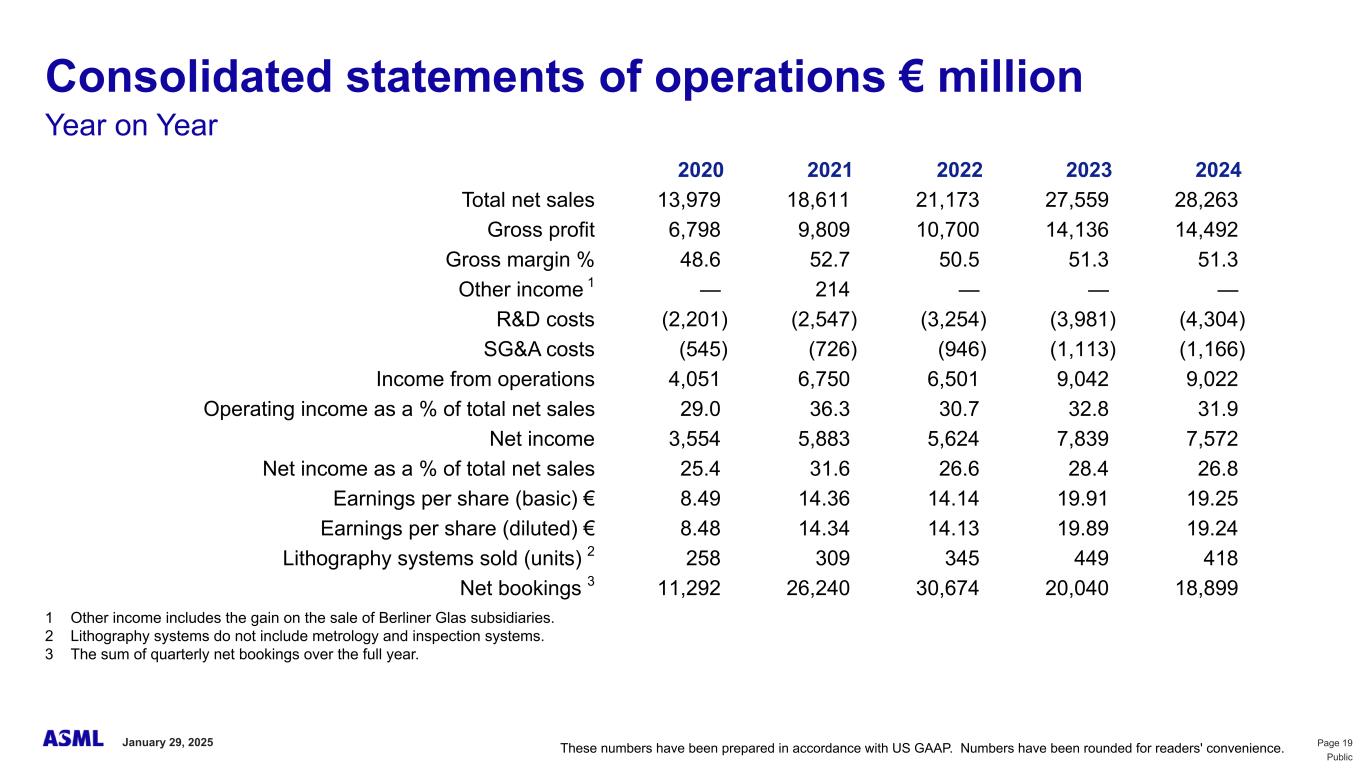 第18页1月29日,2025年公共合并经营报表百万欧元季度环比2023 Q1 2024 Q2 2024 Q3 2024 Q4 2024总净销售额7,2375,2906,2437,4679,263毛利润3,7172,6973,2123,7934,790毛利率% 51.45 1.05 1.55 0.85 1.7研发成本(1,041)(1,032)(1,101)(1,055)(1,116)SG & A成本(284)(273)(277)(297)(318)营业收入2,3921,3921,8342,4413,356营业收入占总净销售额的百分比33.1 26.32 9.43 2.7 36.2净收入2,0481,2241,5782,0772,693净收入占总净销售额的百分比28.32 3.125.3 27.82 9.1每股收益(基本)欧元5.21 3.11 4.01 5.286.85每股收益(稀释)欧元5.20 3.11 4.01 5.286.84已售光刻系统(台)112470100116132净预订量29,1863,6115,5672,6337,0881光刻系统不包括计量和检测系统。2净预订量包括所有系统销售订单和通胀相关调整,已接受书面授权。这些数字是根据美国通用会计准则编制的。为方便读者阅读,数字已四舍五入。