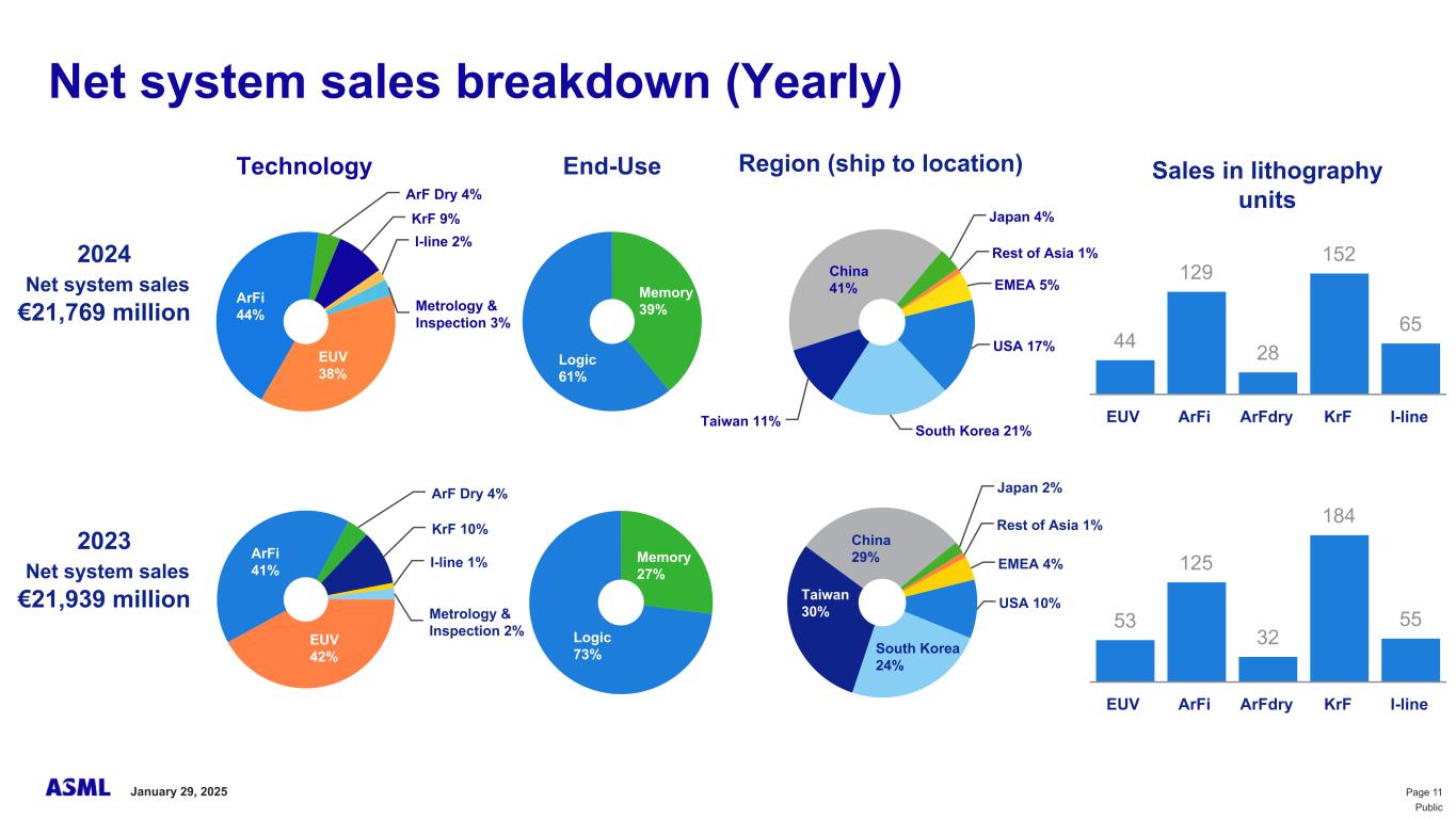 第10页1月29日,2025年公共存储器36% Logic 64%净系统销售额细分(季度)最终用途存储器39% Logic 61%光刻单元销售额143965221 EUV ArFi ArFDry KrF I-line光刻单元销售额113874218 EUV ArFi ArFDry KrF I-line Q4’24净系统销售额71.16亿欧元Q3’24净系统销售额59.26亿欧元EUV 35% ArFi 48% ArF Dry 3% KrF 10% I-line 2% Metrology & Inspection 2% USA 21% South Korea 15% Taiwan 15% China 47% Japan 2% Technology EUV 42% ArFi 41% ArF Dry 2% KrF 9% I-line 2% Metrology & Inspection 4% Region(ship到所在地)美国28%韩国25%台湾10%中国27%日本10%