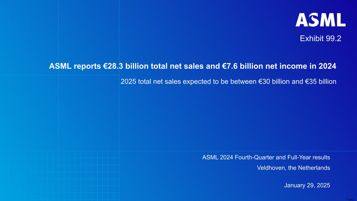ASML 2024年第四季度和全年业绩荷兰维尔德霍芬2025年1月29日丨ASML报告2024年总净销售额为283亿欧元,净收入为76亿欧元2025年总净销售额预计在300亿欧元至350亿欧元之间附件 99.2
