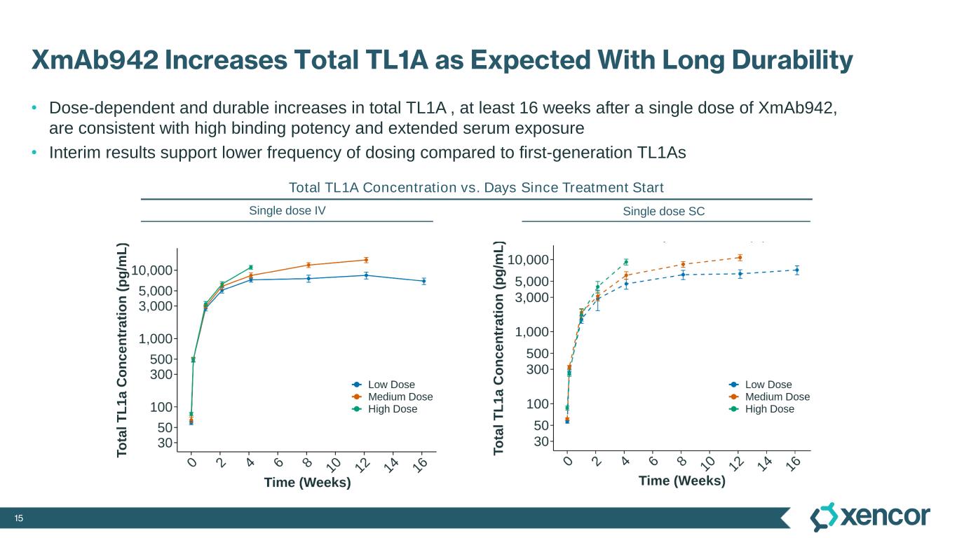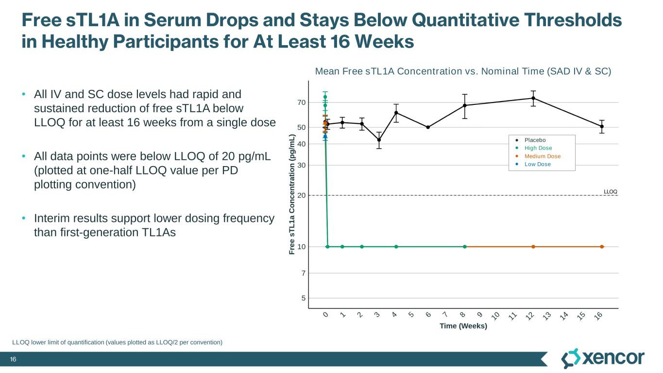 15 XMAB942如预期增加总TL1A,持久性长•总TL1A的剂量依赖性和持久性增加,在单剂量XMAB942后至少16周,与高结合效力和延长的血清暴露一致•中期结果支持与第一代TL1As总TL1A浓度相比,与治疗开始后的天数相比,给药频率更低单剂量IV单剂量SC