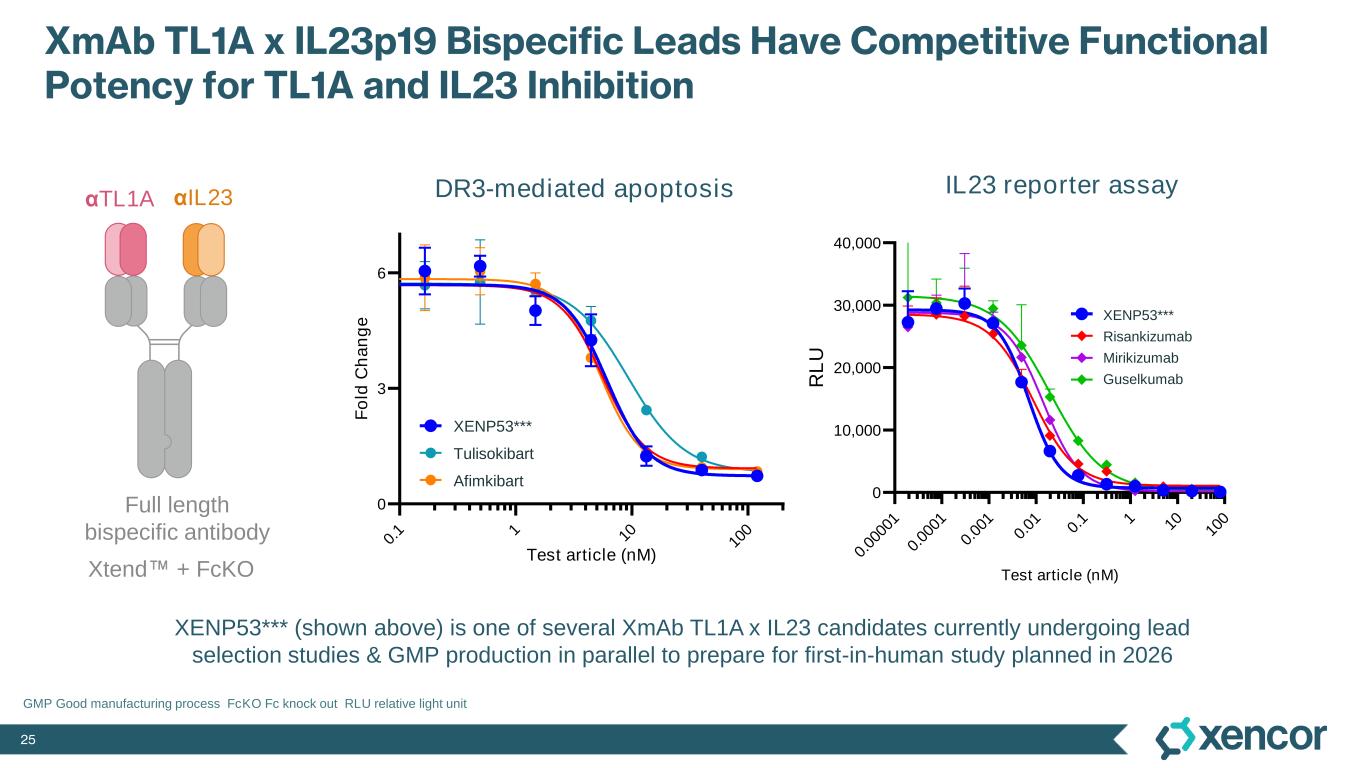 25个XMAB TL1A x IL23p19双特异性引线对TL1A和IL23抑制XENP53具有竞争性功能效力***(如上图所示)是目前正在并行进行先导选择研究和GMP生产的几个XMAB TL1A x IL23候选药物之一,为计划于2026年进行的首次人体研究0做准备。111010036试验品(nm)F o ld C h a n g e Xencor TL1a x IL23罗氏/罗万特默沙东/普罗米修斯0。00 00 1 0.00 01 0.00 1 0.01 0.11101000010000 20000 300003000040000试验品(nm)R L U Xencor TL1a x IL23 Risankizumab Mirikizumab Guselkumab DR3介导的细胞凋亡IL23报告基因测定GMP良好制造工艺FCKO FC敲除RLU相对光单位全长双特异性抗体α TL1A α IL23 XTend + FCKO ENP53***Tulisokibart阿菲姆基巴特ENP53***i i iri i l