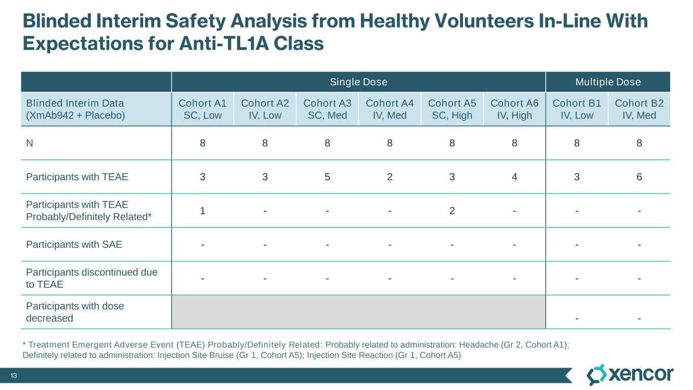 13例来自健康志愿者的盲期中安全性分析符合预期的抗TL1A类单剂量多剂量盲期中数据(XMAB942 +安慰剂)队列A1 SC、低队列A2 IV、低队列A3 SC、Med队列A4 IV、Med队列A5 SC、高队列A6 IV、高队列B1 IV、低队列B2 IV,Med N88888888 8参与者TEAE33523436参与者TEAEprobably/definitely related*1---2---SAE参与者-------参与者因TEAE-------------------------------------------------------------------------------------------------------------------------------------------*治疗紧急不良事件(TEAEE)可能/肯定相关:可能与给药有关:头痛(GR2,队列A1);肯定与给药有关:注射部位瘀伤(GR1,队列A5);注射部位反应(GR1,队列A5)
