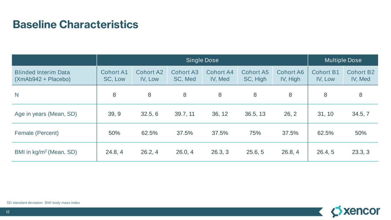 12条基线特征单剂量多剂量盲中期数据(XMAB942 +安慰剂)队列A1 SC、低队列A2 IV、低队列A3 SC、Med队列A4 IV、Med队列A5 SC、高队列A6 IV、高队列B1 IV、低队列B2 IV、Med N 8888888888 8岁年龄(平均值,SD)39、932.5、639.7、1136、1236.5、1326、231、1034.5、7女性(百分比)50% 62.5% 37.5% 37.5% 75% 37.5% 62.5% 50%以kg/m2(平均值,SD)计的BMI 24.8,426.2,426.0,526.8,426.4,523.3,3SD标准差BMI体重指数