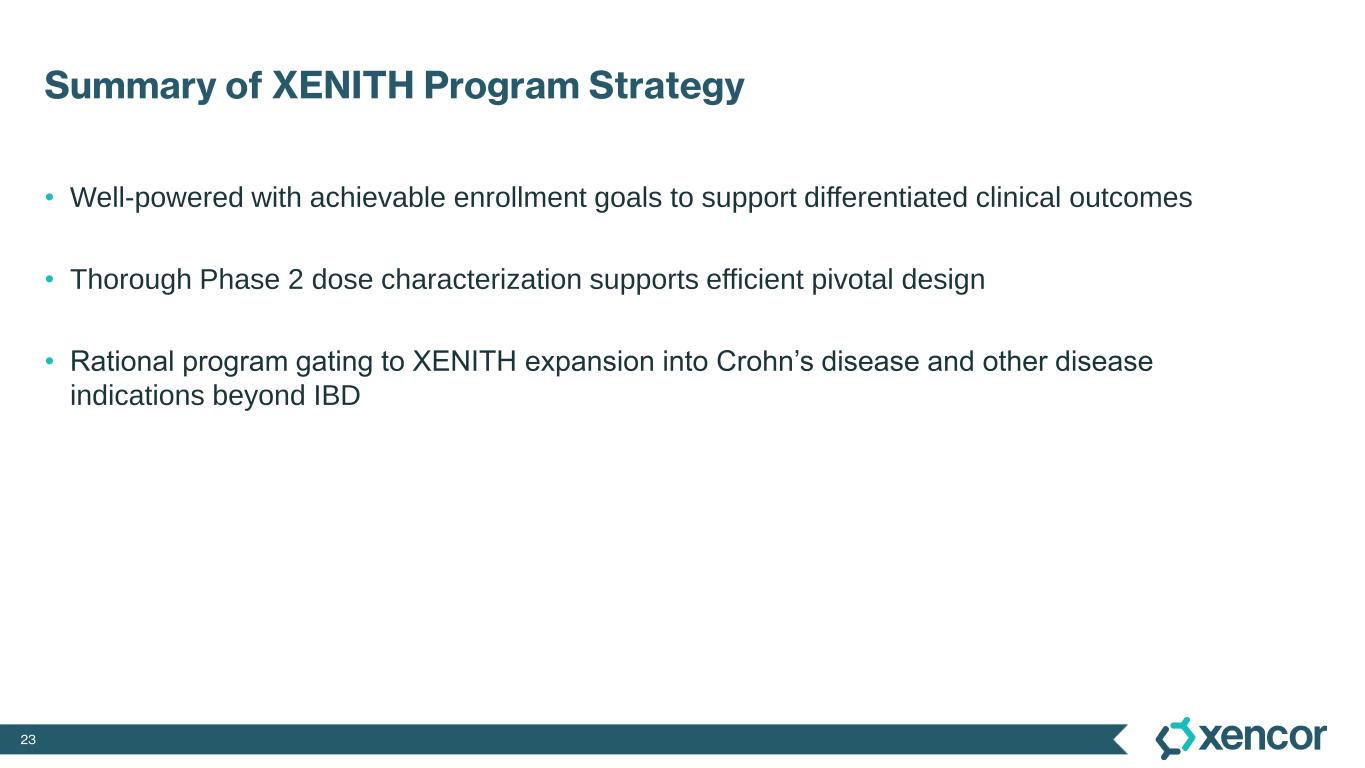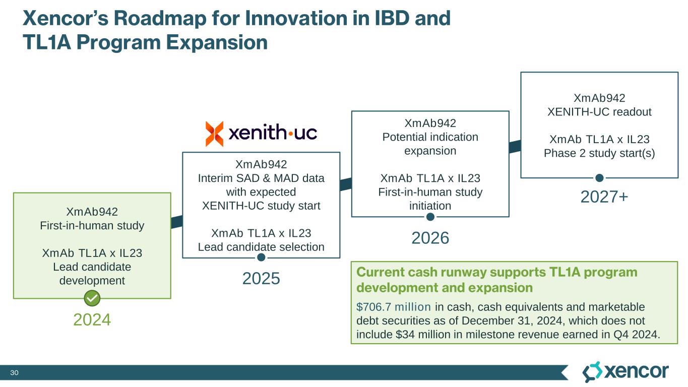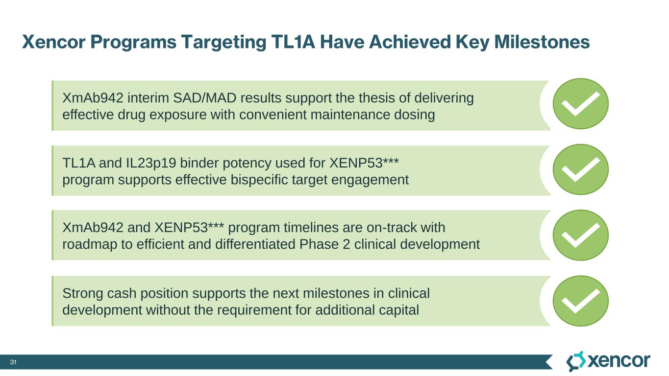 31个XMAB942中期SAD/MAD结果支持以方便的维持剂量TL1A和IL23p19粘合剂效力递送有效药物暴露的论点,用于XENP53***程序支持有效的双特异性目标接合XMAB942和XENP53***项目时间表已步入正轨,并附有通往高效和差异化2期临床开发的路线图强劲的现金状况支持临床开发的下一个里程碑,无需额外资本Xencor针对TL1A的项目已实现关键里程碑
