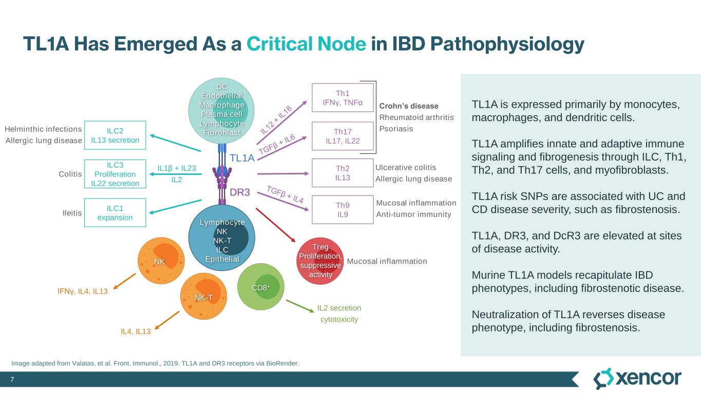 7 TL1A已成为IBD病理生理学中的一个关键节点。TL1A主要由单核细胞、巨噬细胞和树突状细胞表达。TL1A通过ILC、Th1、Th2和Th17细胞以及肌成纤维细胞扩增先天和适应性免疫信号和纤维化发生。TL1A风险SNPs与UC和CD疾病的严重程度相关,例如纤维狭窄。TL1A、DR3、DCR3在疾病活动部位升高。鼠TL1A模型概括了IBD表型,包括纤维狭窄疾病。TL1A的中和可逆转疾病表型,包括纤维狭窄。Th1 IFN γ、TNF α Th17 IL17、IL22 Th2 IL13 Th9 IL9 ILC2 IL13分泌ILC3增殖IL22分泌ILC1扩增treg增殖、抑制活性CD8 + IL2分泌细胞毒性NK-T NK IFN γ、IL4、IL13 IL4、IL13 IL1 β + IL23 IL2 DC内皮巨噬细胞浆细胞淋巴细胞成纤维细胞淋巴细胞NK NK-T ILC上皮感染蠕虫变应性肺病结肠炎克罗恩病类风湿性关节炎银屑病溃疡性结肠炎变应性肺病黏膜炎症抗肿瘤免疫黏膜炎症DR3 TL1A图像改编自Valatas等Immunol.,2019年。TL1A和DR3受体通过BioRender。