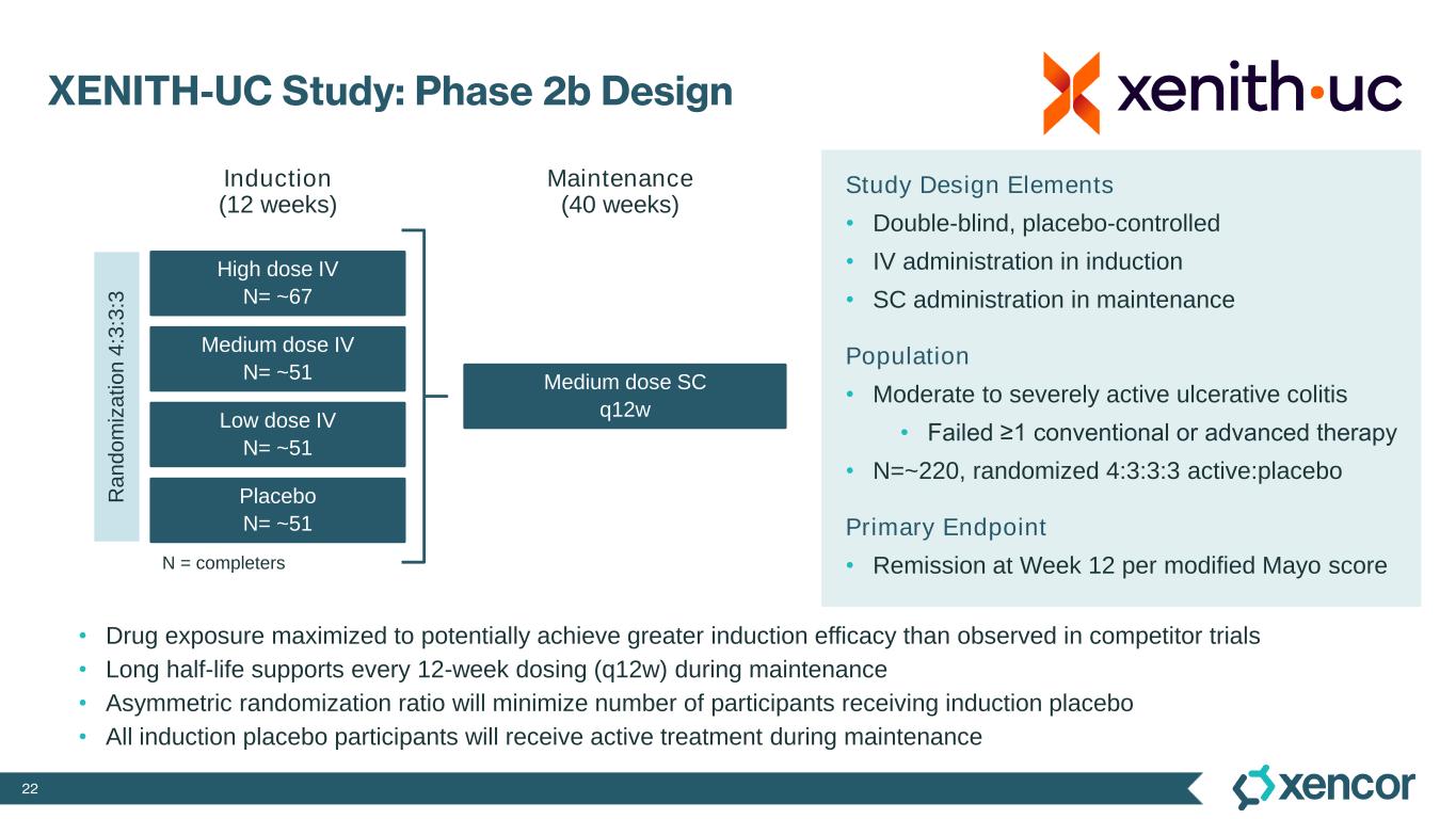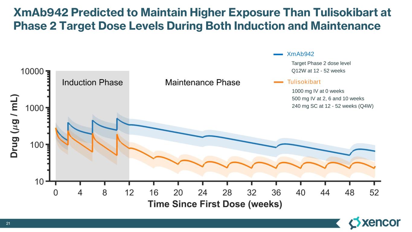 21 XMAB942预测在诱导和维持期间的2期目标剂量水平上保持比Tulisokibart更高的暴露量Tulisokibart 1000 mg IV在0周500 mg IV在2、6和10周240 mg SC在12-52周(Q4W)XMAB942目标2期剂量水平Q12W在12-52周