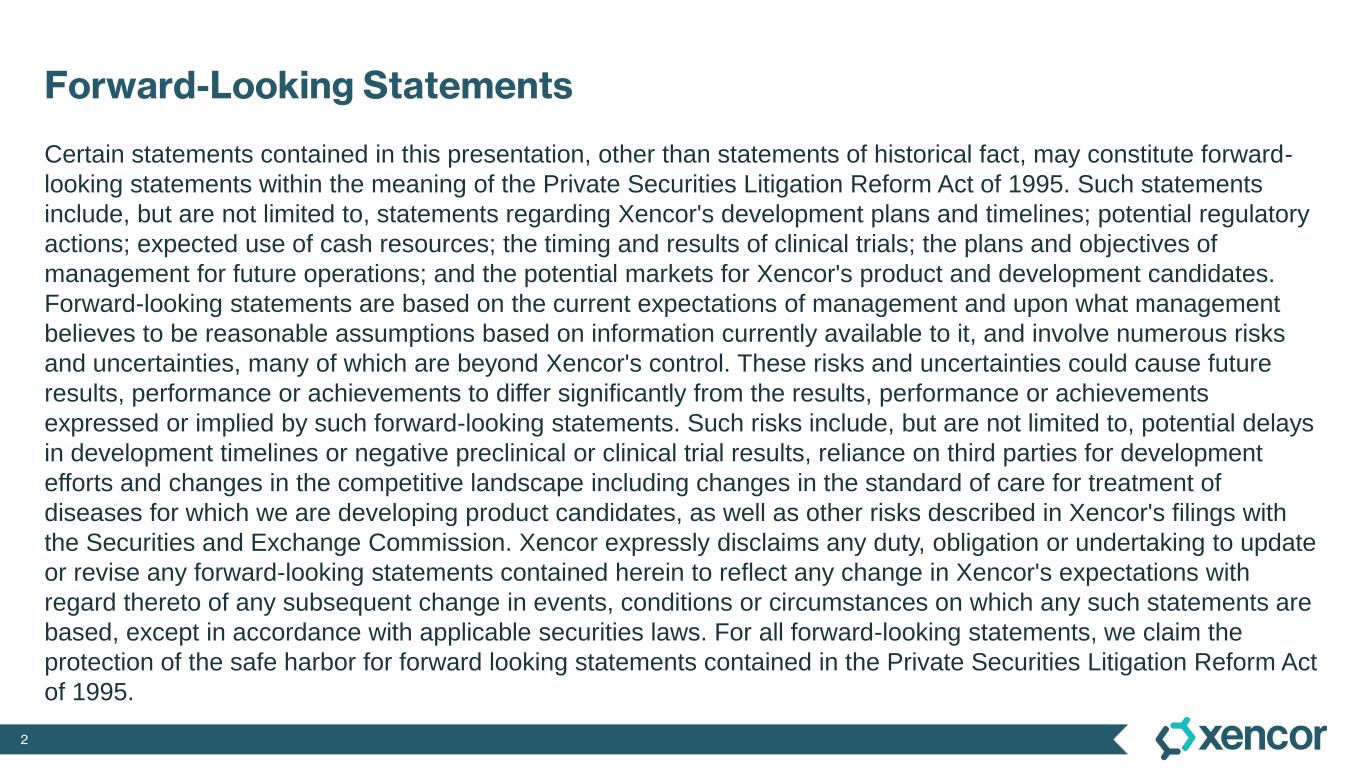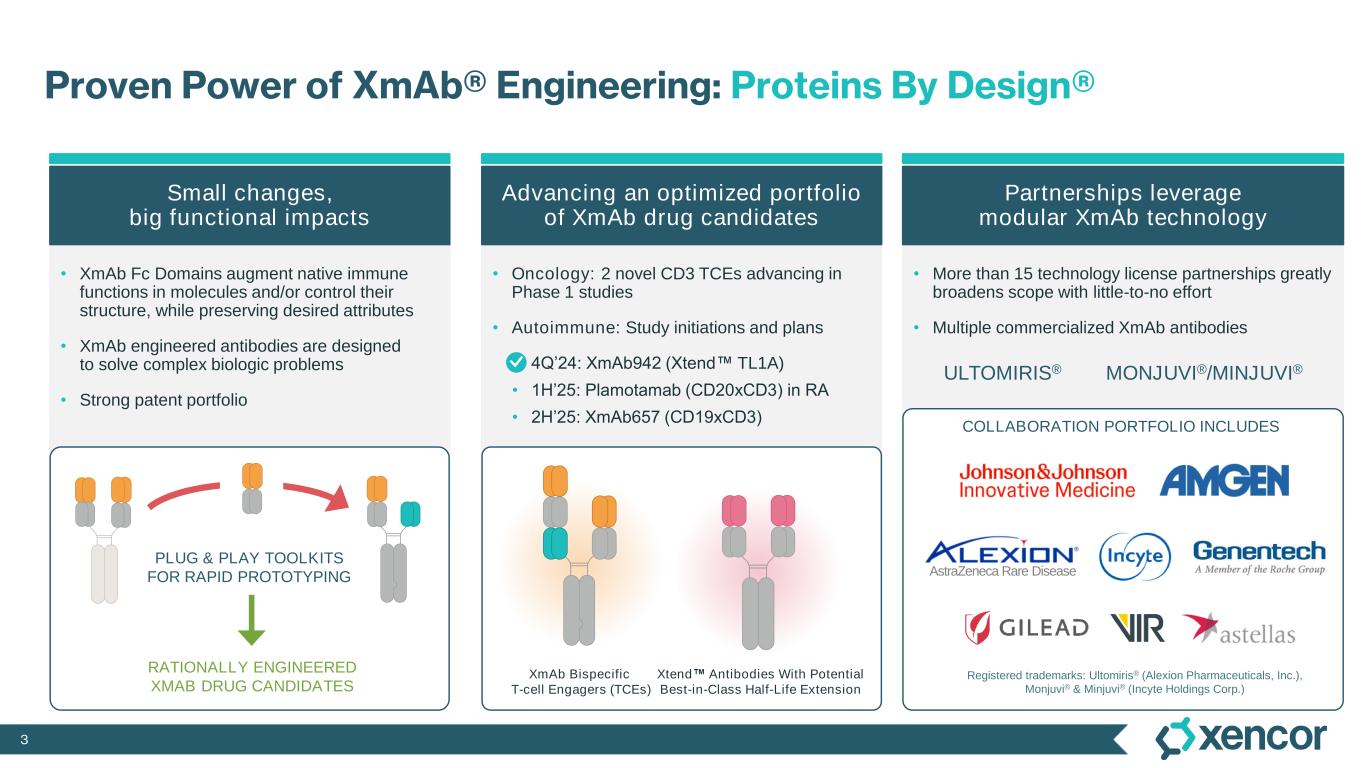 2前瞻性陈述本演示文稿中包含的某些陈述,除历史事实陈述外,可能构成1995年《私人证券诉讼改革法案》含义内的前瞻性陈述。此类声明包括但不限于有关Xencor的开发计划和时间表;潜在的监管行动;现金资源的预期用途;临床试验的时间安排和结果;管理层对未来运营的计划和目标;以及Xencor的产品和开发候选产品的潜在市场的声明。前瞻性陈述基于管理层当前的预期,以及管理层根据目前可获得的信息认为合理的假设,涉及众多风险和不确定性,其中许多超出了Xencor的控制范围。这些风险和不确定性可能导致未来的结果、业绩或成就与此类前瞻性陈述明示或暗示的结果、业绩或成就存在显着差异。此类风险包括但不限于开发时间表的潜在延迟或负面的临床前或临床试验结果、开发工作依赖第三方以及竞争格局的变化,包括我们正在开发候选产品的疾病治疗护理标准的变化,以及Xencor向美国证券交易委员会提交的文件中描述的其他风险。Xencor明确表示不承担任何义务、义务或承诺更新或修改此处包含的任何前瞻性陈述,以反映Xencor对任何此类陈述所依据的事件、条件或情况的任何后续变化的预期的任何变化,除非根据适用的证券法。对于所有前瞻性陈述,我们要求保护1995年《私人证券诉讼改革法案》中包含的前瞻性陈述的安全港。