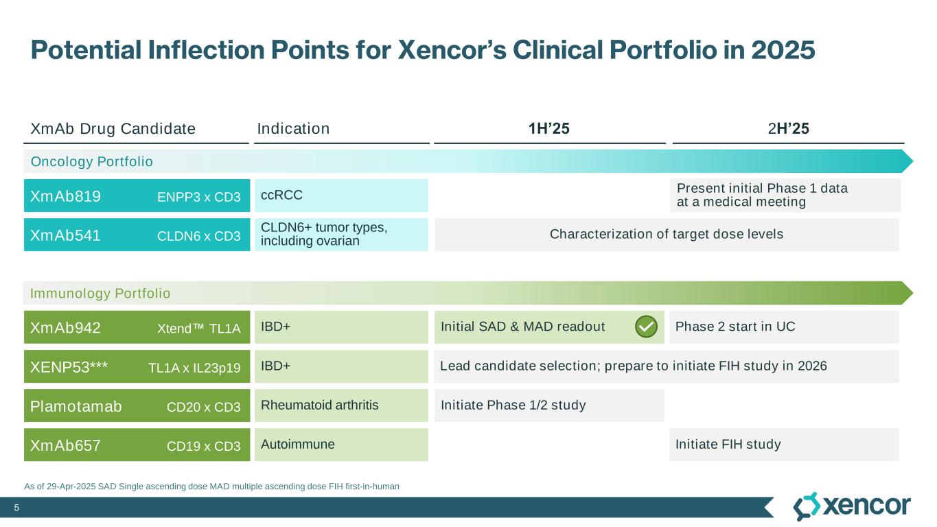 Xencor 2025年XMAB候选药物适应症肿瘤学组合CLDN6 +肿瘤类型临床组合的5个潜在拐点,包括ovarianXMAB541 CLDN6 x CD3表征目标剂量水平XMAB942 XTend TL1A IBD +初始SAD & MAD读数2期开始在UC中Plamotamab CD20 x CD3类风湿性关节炎启动1/2期研究XMAB657 CD19 x CD3自身免疫启动FIHR研究1H‘25 2H’25免疫学组合截至2025年4月29日SAD单次递增剂量MAD多次递增剂量FIHfirst in human XMAB819 ENPP3 x CD3 cCRCC在医学会议上提供初始1期数据XENP53***TL1A x IL23p19 IBD +主要候选人遴选;准备于2026年启动FIH研究