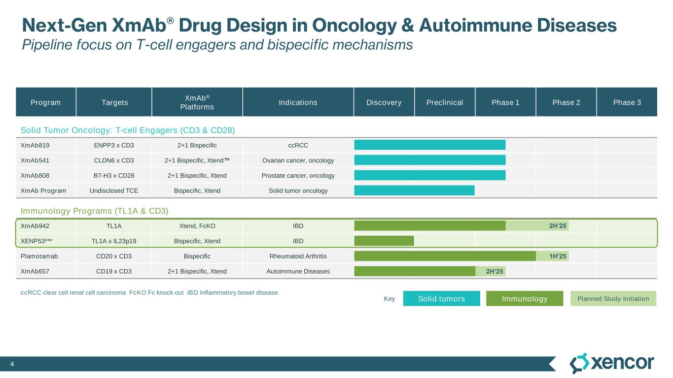 4个项目瞄准XMAB®平台适应症发现临床前1期2期3期实体瘤肿瘤学:T细胞接合器(CD3 & CD28)XMAB819 ENPP3 x CD3 2 + 1双特异性cCRCC XMAB541 CLDN6 x CD3 2 + 1双特异性、XTend卵巢癌、肿瘤学XMAB808 B7-H3 x CD28 2 + 1双特异性、XTend前列腺癌、肿瘤学XMAB计划未披露的TCE双特异性、XTend实体瘤肿瘤免疫学计划(TL1A & CD3)XMAB942 TL1A XTend、FCKO IBD XENP53***TL1A x IL23p19双特异性,XTend IBD Plamotamab CD20 x CD3双特异性类风湿性关节炎XMAB657 CD19 x CD3 2 + 1双特异性,XTend自身免疫性疾病实体瘤免疫学关键cCRCC透明细胞肾细胞癌fcKO fc敲除IBD炎症性肠病1H‘25 2H’25计划研究启动下一代XMAb®肿瘤学药物设计&自身免疫性疾病管线聚焦T细胞接合剂和双特异性机制2H'25
