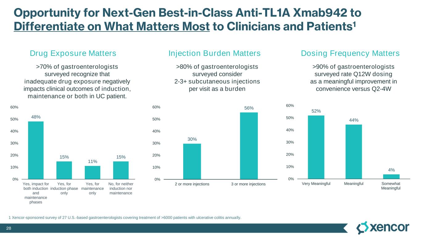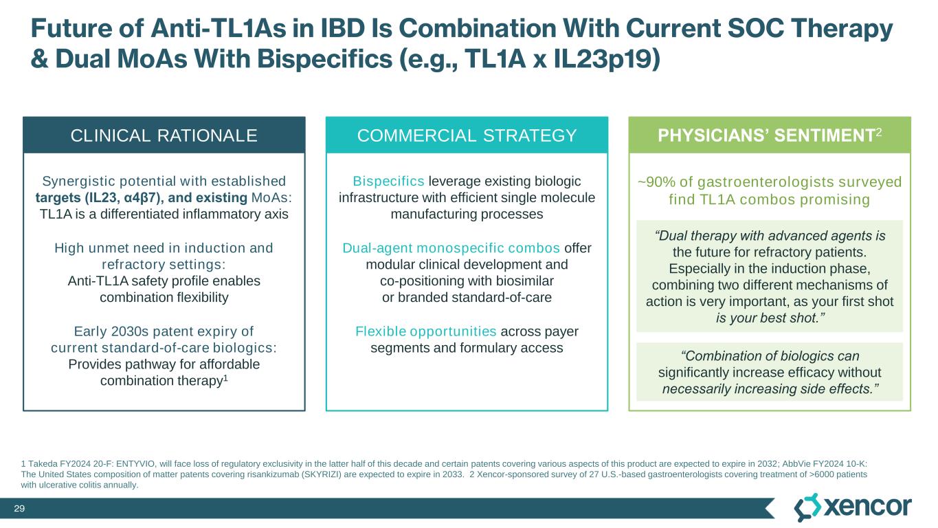 291 Takeda FY2024 20-F:ENTYVIO,将在本十年后半段面临失去监管独占性,涉及该产品各个方面的某些专利预计将于2032年到期;艾伯维FY2024 10-K:涵盖risankizumab(SKYRIZI)的美国成分物质专利预计将于2033年到期。2由Xencor赞助的对27名美国胃肠病学家的调查,涵盖每年治疗超过6000名溃疡性结肠炎患者。IBD中抗TL1As的未来是与当前的SOC疗法&具有双特异性的双MoAs(例如,TL1A x IL23p19)的临床理性协同潜力与既定靶点(IL23,α 4 β 7)相结合,和现有的MoAs:TL1A是一种差异化的炎症轴诱导和难治性环境中的高度未满足需求:抗TL1A安全性特征使组合灵活性成为可能当前标准护理生物制剂的专利在2030年代初到期:为负担得起的联合疗法提供了途径1商业战略双特异性利用现有的生物基础设施和高效的单分子制造工艺双剂单特异性组合提供模块化临床开发和与生物仿制药或品牌护理标准共同定位的灵活机会,跨越付费人群和处方集访问医生的情绪2~90%接受调查的消化科医生发现TL1A组合很有希望“先进药物的双重治疗是难治性患者的未来。尤其是在诱导阶段,结合两种不同的动作机制非常重要,因为你的第一枪就是你最好的一枪。”“生物制剂的组合可以显着提高疗效,而不一定会增加副作用。”