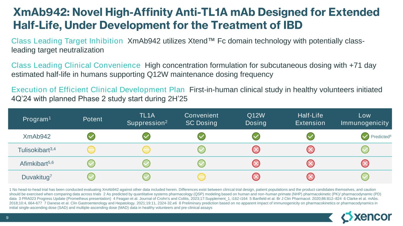 8 XMAB®用于差异化的蛋白质工程,用于新型下一代抗TL1A XENP53的IBD XMAB942设计的潜在同类最佳治疗方案***TL1A x IL-23p19双特异性XTend + FCKO双特异性FC结构域抗TL1A 2 Fabs抗TL1A 1 FAB抗IL23 1 FAB靶材的设计•在胃肠道内对TL1A具有卓越抑制的一流效力•用于高浓度制剂和较低免疫原性风险的XMAB稳定性和溶解度工程•来自XTend FC结构域的长半衰期,旨在延长维持靶材的皮下给药间隔•高度稳定的单价形式,允许皮下制剂并避免大的免疫复合物•非常高的亲和力TL1A和IL23p19结合剂,以提供与单特异性抗体等效的靶点抑制• XTend FC结构域XTend + FCKO阻断IL23p19的长半衰期与IL23p401相比,在不同适应症中给出持续优越的临床结果。21周47 Guselkumab和Ustekinumab在克罗恩病中的疗效基于先前对生物治疗的反应/暴露:GALAXI 2 & 3 3期研究的结果;Danese和Rubin等人;JNJ介绍。2 Guselkumab与Ustekinumab在银屑病关节炎患者中的疗效比较:使用DISCOVER和PSUMMIT试验的个体患者数据进行的调整比较;Thilakarathne和Hassan等人;Rheumatol Ther。2024年2月28日。