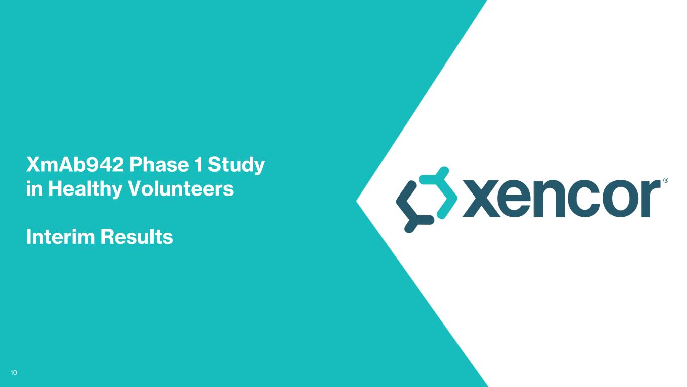 9 XMAB942:专为延长半衰期设计的新型高亲和力抗TL1A MAB,正在开发用于治疗IBD类领先靶点抑制剂XMAB942利用XTend FC域技术,具有潜在的类领先靶点中和类领先的临床便利高浓度制剂用于皮下给药,支持Q12W维持给药频率执行有效的临床开发计划高效的半衰期在健康志愿者中开展的首次人体临床研究,计划在2H'25计划期间开始2期研究1有效的TL1A抑制2方便的SC给药Q12W给药半衰期延长低免疫原性XMAB942 Tulisokibart3,4 Afimkibart5,6 Duvakitug7 1尚未进行针对此处包含的其他数据评估XMAB942的头对头试验。临床试验设计、患者群体和候选产品本身之间存在差异,在跨试验2比较数据时应谨慎行事,正如基于人和非人灵长类动物(NHP)药代动力学(PK)/药效学(PD)数据的定量系统药理学(QSP)模型所预测的那样3 PRA023进度更新(Prometheus presentation)4 Feagan et al. Journal of Crohn's and Colitis,2023;17:Supplement _ 1,i162-i164 5 Banfield et al. br J Clin Pharmacol。2020;86:812 – 8246克拉克等人的单克隆抗体。2018;10:4,664-677 7 Danese et al. Clin Gastroenterology and Hepatology。2021;19:11,2324-32.e6 8在健康志愿者和临床前试验中基于免疫原性对初始单次递增剂量(SAD)和多次递增剂量(MAD)数据的药代动力学或药效学无明显影响的初步预测─ ─ ─预测8