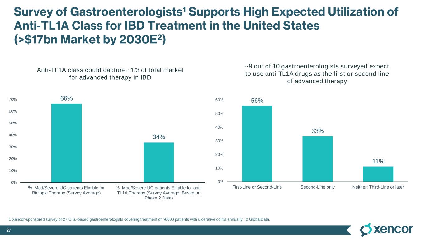271由Xencor赞助的对27名美国胃肠病学家的调查,涵盖每年治疗超过6000名溃疡性结肠炎患者。2 GlobalData。56% 33% 11% 0% 10% 20% 30% 40% 50% 60%一线或二线二线都没有;三线或以后66% 34% 0% 10% 20% 30% 40% 50% 60% 70% 70%符合生物治疗条件的mod/重症UC患者(调查平均数)%符合抗TL1A治疗条件的mod/重症UC患者(调查平均数,基于2期数据)对胃肠病学家的调查1支持在美国将抗TL1A类用于IBD治疗的高预期使用率(到2030E2超过170亿美元的市场)抗TL1A类可占据约1/3的晚期疗法市场,在接受调查的10位胃肠病学家中,约有9位期望将抗TL1A药物作为一线或二线的晚期疗法