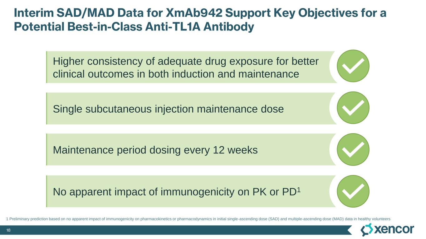 18充分药物暴露的更高一致性可在诱导和维持单次皮下注射维持剂量中获得更好的临床结果维持期给药每12周一次XMAB942的免疫原性对PK或PD1中期SAD/MAD数据没有明显影响支持潜在的同类最佳抗TL1A抗体的关键目标1基于免疫原性对健康志愿者初始单次递增剂量(SAD)和多次递增剂量(MAD)数据中的药代动力学或药效学没有明显影响的初步预测