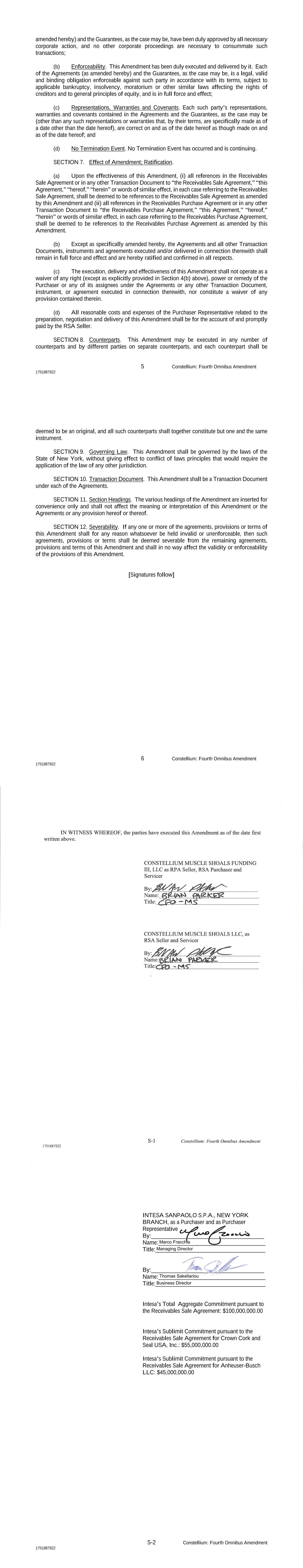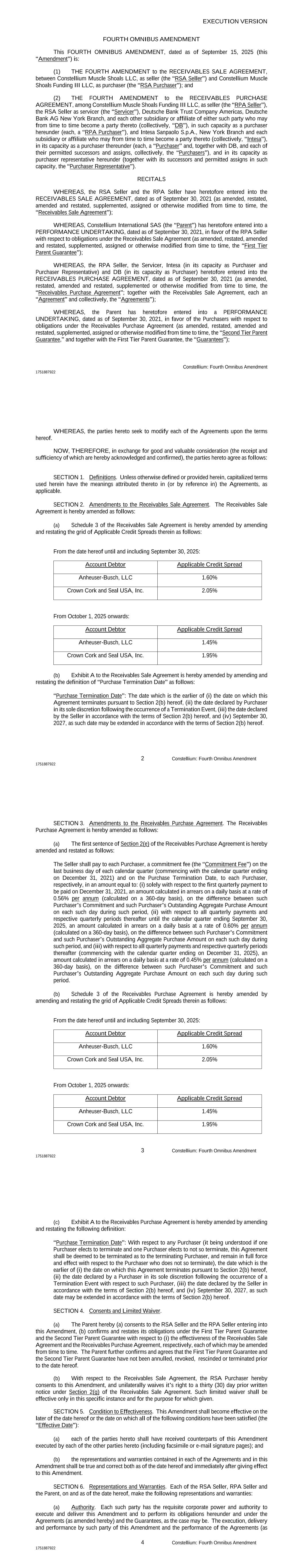 执行版本Constellium:第四次综合修订1751887922 OMNIBUS第四次修订本次OMNIBUS第四次修订,日期为2025年9月15日(本次“修订”)为:(1)应收款项出售协议的第四次修订,由作为卖方的丨Constellium Muscle Shoals LLC(“RSA卖方”)与作为买方的Constellium Muscle Shoals Funding III LLC(“RSA买方”)签署,及(2)应收款项购买协议的第四次修订,以及可能不时成为其一方的任何一方的其他附属公司或关联公司(统称“DB”),以本协议项下买方的身份(各自称为“RPA买方”),以及Intesa SanPaolo S.P.A.、纽约分公司和可能不时成为其一方的各附属公司或关联公司(统称“Intesa”),以本协议项下买方的身份(各自称为“买方”,连同DB,及其各自的许可继承人和受让人,统称“买方”),并以其作为本协议项下买方代表的身份(连同其继任者和以该身份获得许可的受让人,“买方代表”)。RECITALS鉴于RSA卖方与RPA卖方已于此前订立日期为2021年9月30日的应收款出售协议(经不时修订、重述、修订及重述、补充、转让或以其他方式修改,“应收款出售协议”);然而,Constellium International SAS(“母公司”)此前已于2021年9月30日就应收款出售协议项下的义务(经不时修订、重述、修订及重述、补充、转让或以其他方式修改,“第一级母公司担保”)订立有利于RPA卖方的履约承诺;然而,RPA卖方、服务商、Intesa(以买方和买方代表的身份)和DB(以买方的身份)此前订立了日期为2021年9月30日的应收账款购买协议(经不时修订、重述、修订和重述、补充或以其他方式修改,称为“应收账款购买协议”;连同应收账款销售协议,各自为“协议”,统称为“协议”);然而,母公司此前已于2021年9月30日就应收账款购买协议(经修订、重述,不时修订及重述、补充、转让或以其他方式修改的“第二级母公司担保”,连同第一级母公司担保,统称“担保”);2 Constellium:第四次综合修订1751887922鉴于,本协议各方寻求根据本协议的条款修改每一份协议。现据此,为换取良好的、有价值的对价(特此确认并确认其收到及充分性),双方约定如下:第一节。定义。除非本文另有定义或规定,否则本文中使用的大写术语具有适用的协议中(或通过引用)赋予的含义。第2节。应收款项出售协议的修订。应收账款销售协议现修订如下:(a)应收账款销售协议附表3现修订并重述其中适用信用利差网格如下:自本协议之日起至2025年9月30日(含):账户债务人适用信用利差Anheuser-Busch,LLC 1.60% Crown Cork and Seal USA,Inc. 2.05%自2025年10月1日起:账户债务人适用信用利差Anheuser-Busch,LLC 1.45% Crown Cork and Seal USA,Inc.特此修订应收款项销售协议的1.95%(b)附件 A,修订并重述“购买终止日期”的定义如下:“购买终止日期”:(i)本协议根据本协议第2(b)节终止的日期,(ii)终止事件发生后买方全权酌情宣布的日期,(iii)卖方根据本协议第2(b)节条款宣布的日期,及(iv)2027年9月30日中较早者,因此,该日期可根据本条例第2(b)条的规定予以延长。3 Constellium:第四次综合修订1751887922第3条。应收款项购买协议的修订。应收款项购买协议特此修订如下:(a)应收款项购买协议第2节(e)第一句特此修订并重述如下:卖方应向每一买方支付, 在每个日历季度的最后一个营业日(从截至2021年12月31日的日历季度开始)和采购终止日期分别向各买方支付承诺费(“承诺费”),金额等于:(i)仅就将于2021年12月31日支付的第一个季度付款而言,按日计算的拖欠金额,年利率为0.56%(按360天计算),根据该买方的承诺与该买方在该期间内每一该日未偿还的采购总额之间的差额计算,(ii)就所有季度付款及其后各季度期间直至2025年9月30日终了的日历季度而言,按每日按年率0.60%(按360天计算)计算的拖欠款额,按该期间内每一该等日该等买方的承诺与该买方的未付总购买额之间的差额计算,及(iii)就所有季度付款及其后各季度期间(自2025年12月31日终了的日历季度开始)计算,根据该买方的承诺与该买方在该期间内每一该等日的未付总采购金额之间的差额,按年利率0.45%(按360天计算)按日计算的拖欠金额。(b)特此修订应收账款购买协议附表3,修订并重述其中适用信用利差的网格如下:自本协议之日起至2025年9月30日(含):账户债务人适用信用利差Anheuser-Busch,LLC 1.60% Crown Cork and Seal USA,Inc. 2.05%自2025年10月1日起:账户债务人适用信用利差Anheuser-Busch,LLC 1.45% Crown Cork and Seal USA,Inc. 1.95% 4 Constellium:第四次综合修订1751887922(c)《应收款项购买协议》的附件 A特此修订并重述以下定义:“购买终止日期”:就任何买方而言(据了解,如果一名买方选择终止而一名买方选择不终止,则本协议应被视为对终止买方的终止,并对未如此终止的买方继续具有完全效力和效力),(i)本协议根据本协议第2(b)节终止的日期,(ii)买方在发生与该买方有关的终止事件后自行决定宣布的日期,(iii)卖方根据本协议第2(b)节的条款宣布的日期,以及(iv)2027年9月30日中较早的日期,因为该日期可根据本协议第2(b)节的条款延长。第4节。同意及有限豁免。(a)母公司特此(a)同意RSA卖方和RPA卖方订立本修订,(b)确认并重申其根据第一级母公司担保和第二级母公司担保分别就(i)应收款出售协议和应收款购买协议的有效性承担的义务,每一项义务均可不时修订。母公司进一步确认并同意,第一层父母担保和第二层父母担保在本协议日期之前没有被撤销、撤销、撤销或终止。(b)就应收款销售协议而言,RSA买方特此同意本修订,并单方