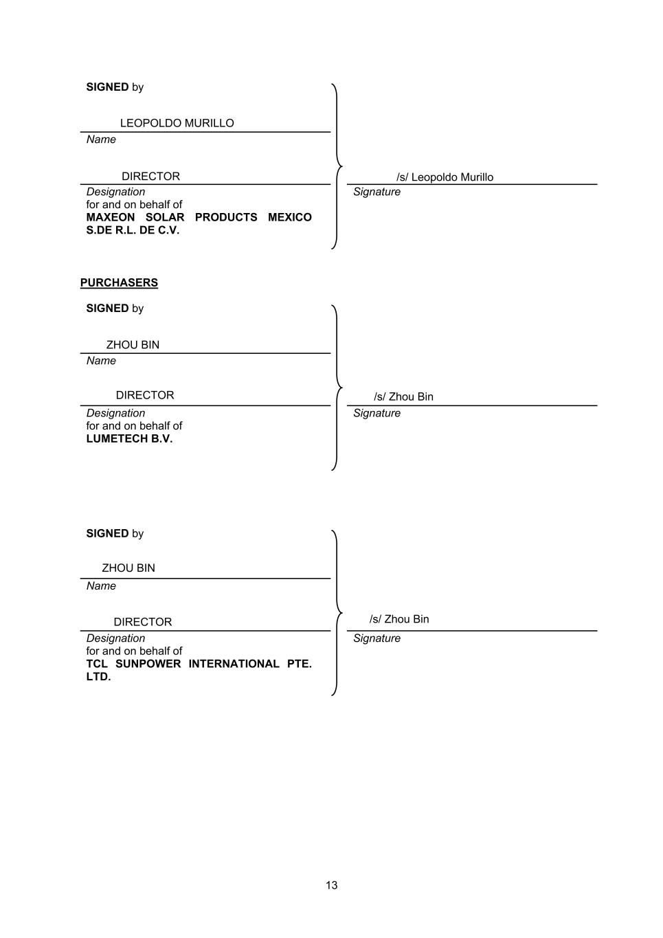 13以名称指定签署为及代表MAXEON SOLAR Products MEXICO S.DER.L. DEC.V.买方以名称指定签署为及代表LUMETECH B.V.以名称指定签署为及代表TCL SUNPOWER International PTE有限公司签署。Leopoldo Murillo总监/s/Leopoldo Murillo Zhoubin总监/s/Zhoubin总监/s/Zhoubin总监/s/Zhoubin总监/s/Zhoubin总监/s/Zhoubin总监/s/Zhoubin总监/s/Zhoubin总监/s/Zhoubin总监/s/Zhoubin总监/s/s/s/s/s/s/s/s/s/s/s/s/s/s/s/s/s/s/s/s/s/s/s/s/