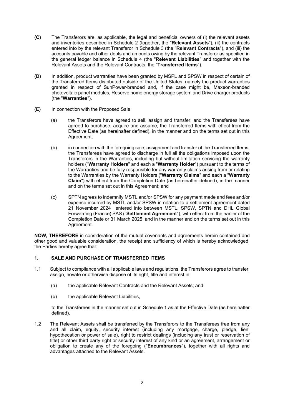 2(c)转让人(如适用)为(i)附表2所述的相关资产和盘存(合称“相关资产”)、(ii)附表3中相关转让人订立的合同(“相关合同”)、以及(iii)附表4总分类账余额中规定的相关转让人的应付账款和其他债务及欠款(“相关负债”,并与相关资产和相关合同合称“已转让项目”)的合法和实益拥有人。(d)此外,MSPL和SPSW已就在美国境外分销的某些转让物品授予产品保证,即就SunPower品牌以及(如果可能的话)Maxeon品牌光伏面板组件、Reserve家庭储能系统和Drive充电器产品授予的产品保证(“保证”)。(e)就建议出售而言:(a)转让人已同意按本协议所载的方式及条款出售、转让及转让,而受让人已同意购买、取得及承担自生效日期(定义见下文)起生效的受让物品;(b)就上述出售、转让及转让受让物品而言,受让人已同意悉数解除在保证中施加于转让人的所有义务,包括但不限于根据保修条款为保修持有人(“保修持有人”及各为“保修持有人”)提供服务,并对由保修持有人产生或与保修有关的任何保修索赔(“保修索赔”及各为“保修索赔”)负全部责任,自完成日期(定义见下文)起生效,(c)SPTN同意赔偿MSTL和/或SPSW就MSTL、SPSW、SPTN和DHL Global Forwarding(France)SAS于2024年11月21日签订的和解协议(“和解协议”)所支付的任何款项以及所产生的费用和/或开支,自完成日期或2025年3月31日(以较早者为准)起生效,并按本协议规定的方式和条款进行赔偿。现,因此,考虑到本协议所载的共同盟约和协议以及其他良好和有价值的对价,特此确认其收到和充分性,双方特此同意:1。转让项目1.1的出售和购买在遵守所有适用法律法规的情况下,转让人同意将其在以下方面的权利、所有权和权益转让、转让、更新或以其他方式处置:(a)适用的相关合同和相关资产;(b)适用的相关负债,在生效日期(定义见下文)按附表1中规定的方式转让、转让、更新或以其他方式处置。1.2相关资产应由转让人在没有任何和所有债权、股权、担保权益(包括任何抵押、押记、质押、留置、抵押或变卖权力)、限制交易的权利(包括任何信托或所有权保留)或任何种类的其他第三方权利或担保权益或设定上述任何一项的协议、安排或义务(“担保物”)的情况下转让给受让人,连同相关资产附带的所有权利和优势。