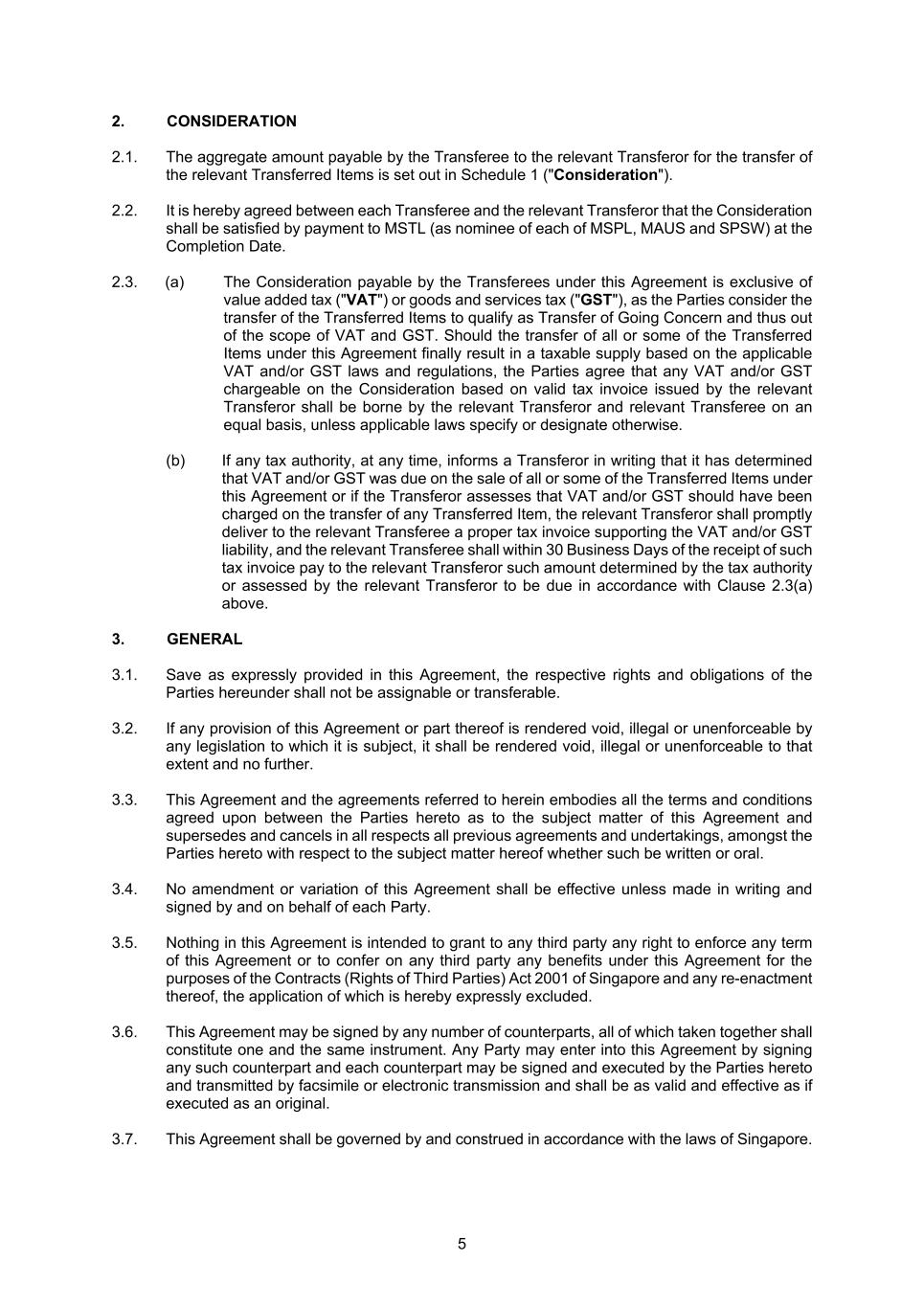 5 2.审议意见2.1。受让方就相关转让项目的转让应付给相关转让方的总金额载于附表1(“对价”)。2.2.各受让方与相关转让方特此约定,于完成日通过向MSTL(作为MSPL、MAUS和SPSW各自的代名人)支付对价的方式支付对价。2.3.(a)受让人根据本协议应付的对价不包括增值税(“VAT”)或货物和服务税(“GST”),因为各方认为转让的项目符合持续经营转让的条件,因此不属于增值税和GST的范围。如果本协议项下转让的全部或部分转让物品最终根据适用的增值税和/或GST法律法规产生应税供应,双方同意,根据相关转让方开具的有效税务发票就对价应征收的任何增值税和/或GST应由相关转让方和相关受让人平等承担,除非适用法律另有规定或指定。(b)如任何税务机关在任何时候书面通知转让人其已确定根据本协议出售全部或部分转让物品应缴纳增值税和/或商品及服务税,或如果转让人评估任何转让物品的转让应收取增值税和/或商品及服务税,则相关转让人应立即向相关受让人交付与增值税和/或商品及服务税责任相配套的适当税务发票,且相关受让方应在收到该税务发票之日起30个营业日内向相关转让方支付税务机关根据上述第2.3(a)条确定或相关转让方评估到期的金额。3.一般3.1。除本协议明文规定外,双方在本协议项下各自的权利和义务不得转让或转让。3.2.如果本协议的任何条款或其部分因其所受的任何立法而变得无效、非法或不可执行,则应在该程度上使其无效、非法或不可执行,且不得再进一步。3.3.本协议及此处提及的协议体现了双方就本协议标的事项议定的所有条款和条件,并在所有方面取代和取消了双方之前就本协议标的事项达成的所有协议和承诺,无论这些协议和承诺是书面的还是口头的。3.4.本协议的任何修改或变更,除非以书面作出并由各方及各方代表签署,否则不得生效。3.5.本协议的任何内容均无意授予任何第三方任何权利,以强制执行本协议的任何条款,或为新加坡《2001年合同(第三方权利)法》及其任何重新颁布的目的授予任何第三方本协议项下的任何利益,在此明确排除其适用。3.6.本协议可由任意数目的对应方签署,所有这些对应方加在一起构成同一文书。任何一方可通过签署任何此类对应方的方式订立本协议,且每一对应方可由双方签署并执行,并通过传真或电子传输方式传送,其效力和效力应如同签署原件一样。3.7.本协议应受新加坡法律管辖并按其解释。