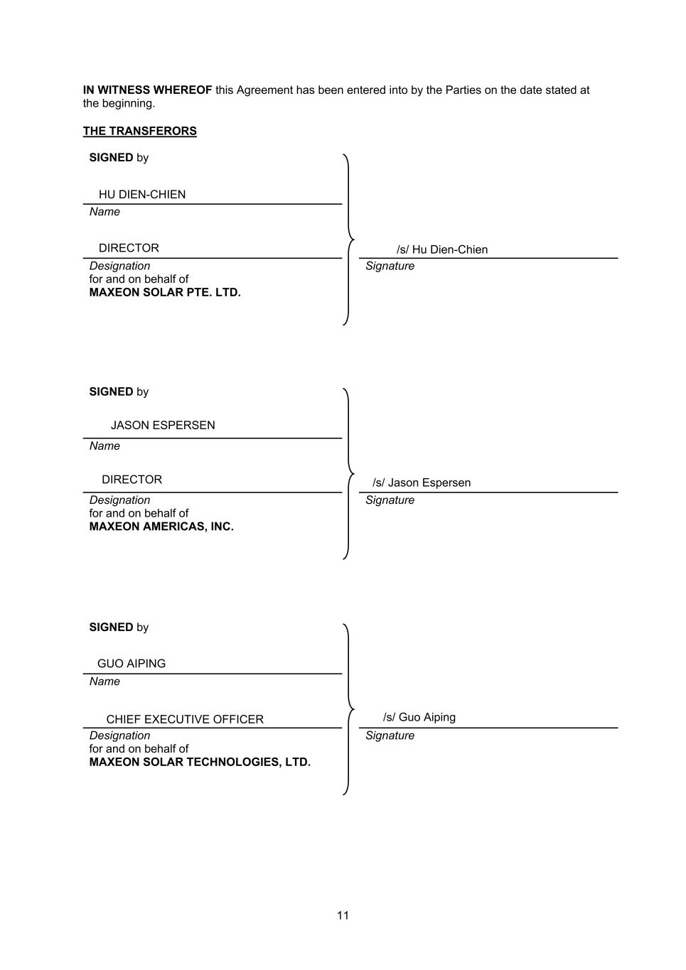 11作为双方在开头所述日期订立本协议的证据。为MAXEON SOLAR PTE有限公司及代表MAXEON SOLAR TERM0有限公司以名称指定签名方式签署的转让人代表MAXEON AMERICAS,INC.以Name Designation Signature签署。以Name Designation Signature为MAXEON SOLAR TECHNOLOGIES,LTD.及代表MAXEON SOLAR TECHNOLOGIES,LTD.签署。胡迪仁董事/s/胡迪坚JASON ESPERSEN董事/s/JASON ESPERSEN郭爱萍行政总裁/s/郭爱平