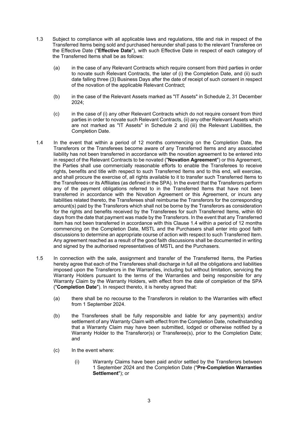 31.3在遵守所有适用法律和法规的情况下,根据本协议出售和购买的转让物品的所有权和风险应在生效日期(“生效日期”)转移给相关受让人,每一类转让物品的生效日期应如下:(a)如有任何相关合同需要第三方同意才能更新此类相关合同,则(i)完成日期中较晚者,(ii)该日期在收到有关适用的相关合同更替的同意日期后三(3)个营业日;(b)就附表2中标记为“IT资产”的相关资产而言,为2024年12月31日;(c)就(i)为更替该等相关合同而无需征得第三方同意的任何其他相关合同而言,(ii)附表2中未标记为“IT资产”的任何其他相关资产,以及(iii)相关负债,则为完成日期。1.4如在自完成日起计的12个月期间内,转让人或受让人知悉任何已转让的物品,且任何相关负债并未根据将就待更新的相关合同(“更新协议”)或本协议订立的更新协议转移,则各方应通过商业上合理的努力,使受让人能够获得与该等已转让物品有关的权利、利益和所有权,并为此目的,将行使,并应促使行使,其拥有的将此类转让物品转让给受让人或其关联公司(如SPA中所定义)的所有权利。转让人履行未按照Novation协议或本协议转让的已转让物品中所述的任何付款义务,或产生与之相关的任何责任的,转让人应当自转让人付款之日起60日内,向转让人偿还转让人支付的转让人支付的相应款项,转让人不得作为转让人就该等转让物品所获得的权利和利益的对价。如果任何转让的物品在完成日期开始的12个月期间内没有按照本条款1.4转让,MSTL和买方应进行善意讨论,以确定有关该转让物品的适当行动方案。因善意讨论而达成的任何协议均应以书面形式记录在案,并由MSTL的授权代表和买方签署。1.5就转让物品的出售、转让和转让而言,各方在此同意,各受让人应全额履行在保证中强加给转让人的所有义务和责任,包括但不限于根据保证条款为保证持有人提供服务,并对保证持有人提出的任何保证索赔负责,自SPA完成之日(“完成日期”)起生效。就此,兹同意:(a)自2024年9月1日起,不得就保证向转让人追索。(b)受让人须对自完成日期起生效的任何担保索赔的任何付款和/或解决承担全部责任和责任,尽管担保索赔可能已在完成日期之前由担保持有人向转让人或受让人提交、提出或以其他方式通知;及(c)在以下情况下:(i)担保索赔已于2024年9月1日至完成日期期间由转让人支付和/或解决(“完成前担保解决”);或