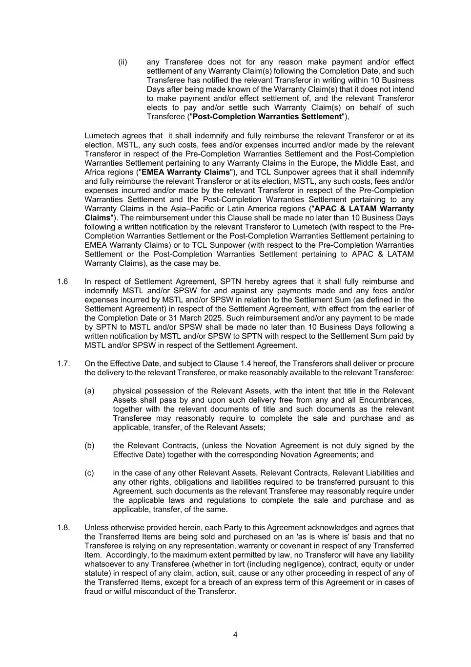4(ii)任何受让人在完成日期后不以任何理由就任何质保索赔进行付款和/或生效结算,且该受让人在获悉质保索赔后10个营业日内已书面通知相关转让人其无意进行付款和/或生效结算,且相关转让人选择代表该受让人支付和/或结算该等质保索赔(“完成后质保结算”),Lumetech同意其应赔偿并全额偿还相关转让人或其选择的MSTL的任何此类费用,相关转让方就欧洲、中东和非洲地区的任何保修索赔(“EMEA保修索赔”)相关的竣工前保修结算和竣工后保修结算发生和/或发生的费用,TCL SunPower同意对相关转让方或其选择的MSTL进行赔偿并全额偿还任何此类费用,相关转让方就亚洲-太平洋或拉丁美洲区域的任何担保索赔(“APAC & LATAM担保索赔”)相关的完成前担保结算和完成后担保结算产生和/或支付的费用和/或费用。本条款下的偿付应不迟于相关转让方向Lumetech(就与EMEA质保索赔有关的完成前担保结算或完成后担保结算)或TCL Sunpower(就与APAC & LATAM质保索赔有关的完成前担保结算或完成后担保结算)(视情况而定)发出书面通知后10个工作日内进行。1.6就和解协议而言,SPTN特此同意,就MSTL和/或SPSW就和解协议所支付的任何款项以及MSTL和/或SPSW就和解金额(定义见和解协议)所产生的任何费用和/或开支,自完成日或2025年3月31日(以较早者为准)起,全额偿还和赔偿MSTL和/或SPSW。此类偿还和/或SPTN向MSTL和/或SPSW支付的任何款项应不迟于MSTL和/或SPSW就MSTL和/或SPSW就和解协议支付的和解款项向SPTN发出书面通知后的10个工作日内支付。1.7.在生效日期,并在不违反本条款第1.4条的情况下,转让人应向相关受让方交付或促使交付,或向相关受让方合理提供:(a)对相关资产的实物占有,意图使相关资产上的所有权在交付时经过且在交付时不受任何和所有产权负担,连同相关所有权文件和相关受让方为完成相关资产的出售和购买以及在适用情况下的转让可能合理要求的文件;(b)相关合同,(除非Novation协议未在生效日期前正式签署)连同相应的Novation协议;及(c)就任何其他相关资产、相关合同、相关负债以及根据本协议要求转让的任何其他权利、义务和负债而言,相关受让人根据适用法律法规可能合理要求的文件,以完成出售和购买以及在适用情况下进行转让。1.8.除非本协议另有规定,本协议的每一方均承认并同意,转让的物品是在“原样”的基础上进行销售和购买的,并且任何受让人都不依赖任何关于任何转让物品的任何陈述、保证或契约。因此,在法律允许的最大范围内,除违反本协议的明确条款或转让人的欺诈或故意不当行为的情况外,任何转让人都不会就任何转让物品的任何索赔、诉讼、诉讼、因由或任何其他程序对任何受让人(无论是侵权(包括疏忽)、合同、股权或法规)承担任何责任。