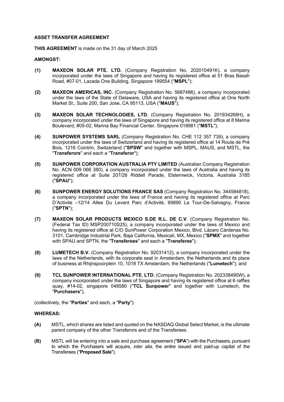 资产转让协议本协议于2025年3月31日订立,包括:(1)MAXEON SOLAR PTE LTD.(公司注册号202010491k),一家根据新加坡法律注册成立的公司,注册办事处位于51 Bras Basah Road,# 07-01,Lazada One Building,Singapore 189554(“MSPL”);(2)MAXEON AMERICAS,INC.(公司注册号5687486),一家根据美国特拉华州法律注册成立的公司,注册办事处位于One North Market St.,Suite 200,San Jose,AAA,95113,USA(“MAUS”);(3)MAXEON SOLAR TECHNOLOGIES一家根据新加坡法律注册成立的公司,注册办事处位于8 Marina Boulevard,# 05-02,Marina Bay Financial Center,Singapore 018981(“MSTL”);(4)SUNPOWER SYSTEMS SARL(公司注册号CHE 112357739),一家根据瑞士法律注册成立的公司,注册办事处位于14 Route de Pr é Bois,1216 Cointrin,Switzerland(“SPSW”,连同MSPL、MAUS和MSTL,即“转让方”,各自为“转让方”);(5)SUNPOWER CORPORATION AUSTRALIA PTY有限公司(澳大利亚公司注册号ACN 009066380),一家根据澳大利亚法律注册成立的公司,注册办事处位于Suite 207/28 Riddell Parade,Elsternwick,Victoria,Australia 3185(“SPAU”);(6)SUNPOWER ENERGY SOLUTIONS FRANCE SAS(公司注册号344584818),一家根据法国法律注册成立的公司,注册办事处位于Parc D’Activite – 12/14 Allee Du Levant Parc d'Activit é,69890 La Tour-De-Salvagny,France(“SPTN”);(7)MAXEON SOLAR Products MEXICO S.DER.L. DEC.V.(公司注册号(Federal Tax ID)MSP200710S25),一家根据墨西哥法律注册成立的公司,注册办事处位于C/O SunPower Corporation Mexico,Blvd. L á zaro C á rdenas No. 3101,Cambridge Industrial Park,Baja California,Mexicali,MX,Mexico(“SPMX”,连同SPAU和SPTN,“受让方”,各为“受让方”);(8)LUMETECH B.V.(公司注册号:92031412),一家根据荷兰法律注册成立的公司,公司所在地为荷兰阿姆斯特丹,营业地点为Rhijnspoorplein 10,1018 TX Amsterdam,Netherlands(“Lumetech”);及(9)TCL SUNPOWER一家根据新加坡法律注册成立的公司,其注册办事处位于6 Raffles Quay,# 14-02,Singapore 048580(“TCL Sunpower”,连同Lumetech,“买方”),(统称“双方”,各自为“一方”)。WHEREAS:(a)MSTL,其股票在纳斯达克全球精选市场上市和报价,是其他转让方和受让方的最终母公司。(b)MSTL将与买方订立买卖协议(“SPA”),据此,买方将收购(其中包括)受让人的全部已发行及实收资本(“建议出售”)。
