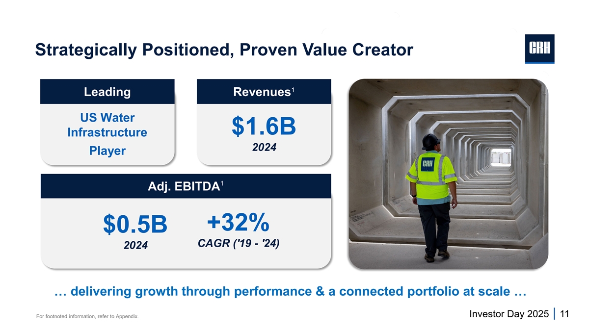 我们的成长算法Growing CRH Leading MegatRends Winning Way Compouner of Capital Infrastructure Transportation x = Water Proven长期交付1两位数盈利增长再工业化投资者2025年第3天有关脚注信息,请参阅附录。