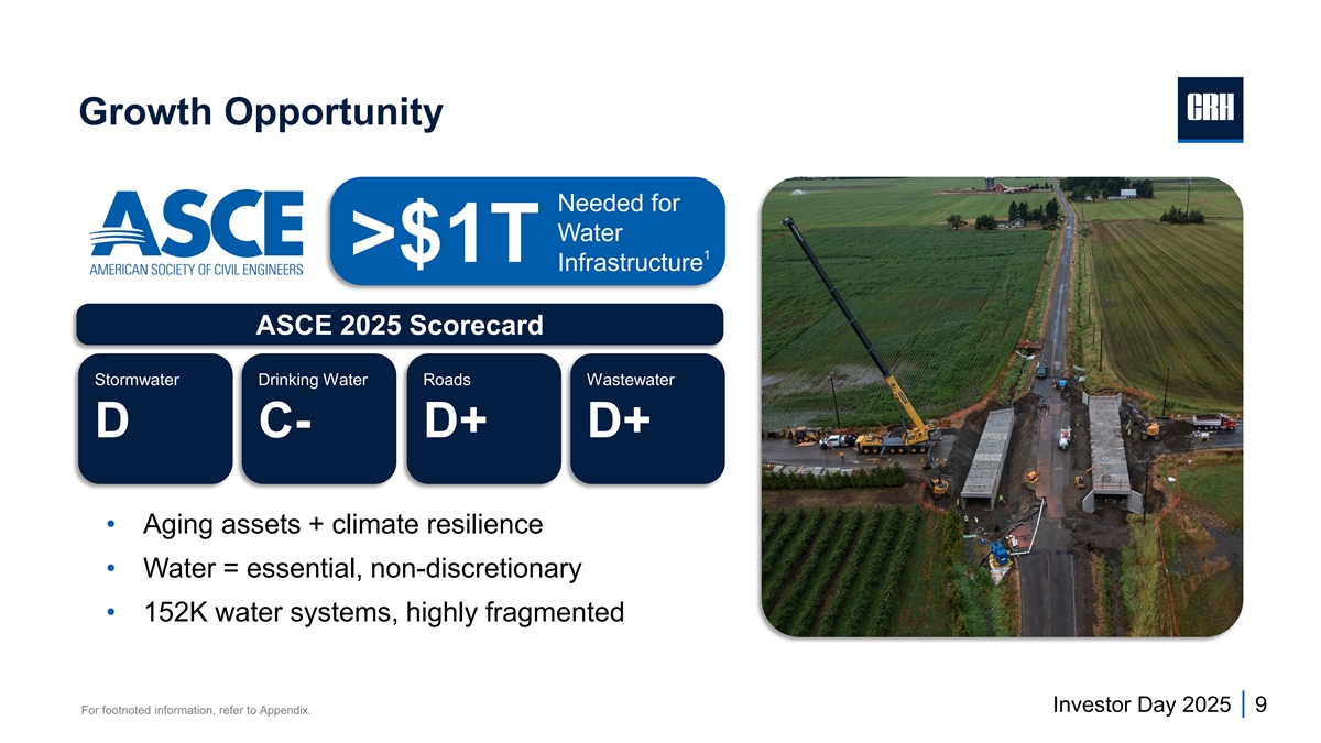 水需要的增长机会1 > $ 1T基础设施ASCE 2025记分卡雨水饮用水道路废水D C-D + D + •老化资产+气候复原力•水=必要的、非自由裁量的• 152K水系统,高度分散的投资者2025年第9天有关脚注信息,请参阅附录。
