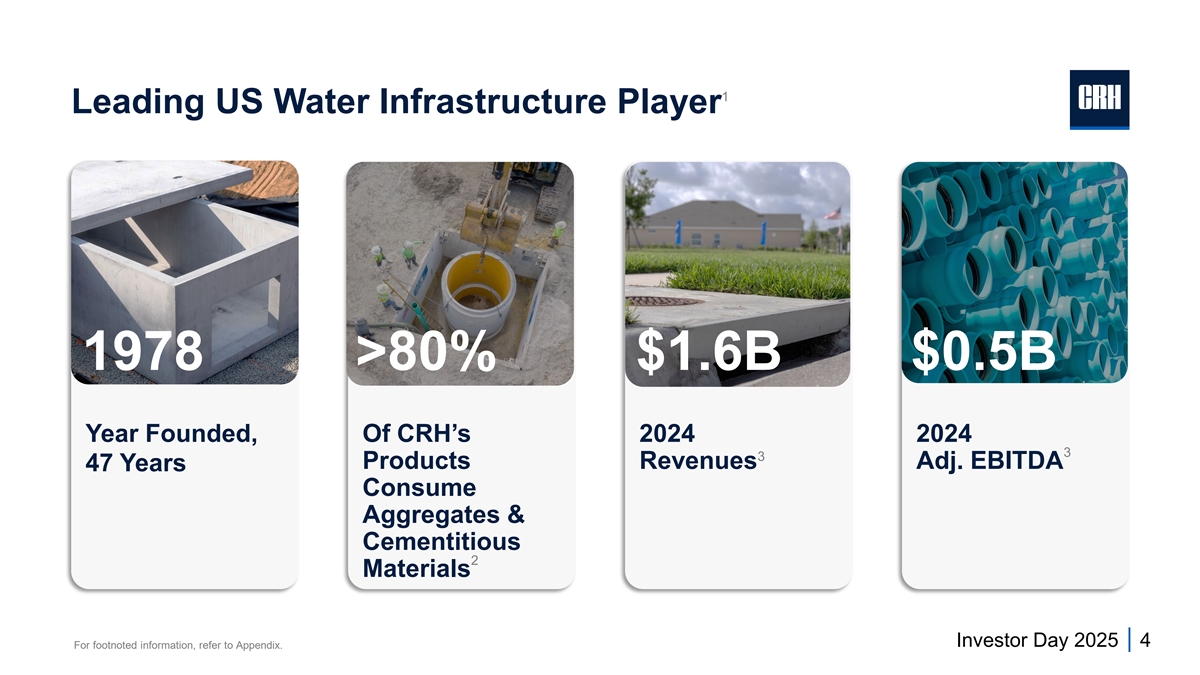 1美国领先的水务基础设施参与者1978 > 80% $ 1.6B $ 0.5B成立年份,占CRH 2024202433产品收入调整后EBITDA 47年消耗总量&水泥2材料投资者2025年第4天有关脚注信息,请参阅附录。