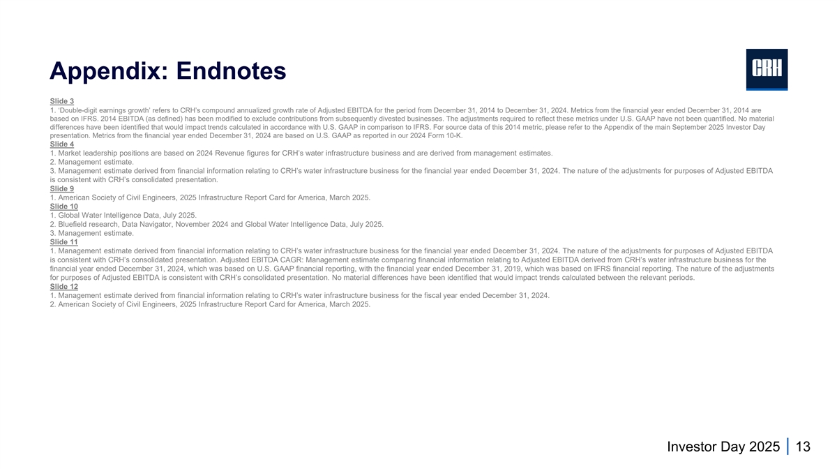附录:尾注幻灯片31。‘两位数盈利增长’是指CRH于2014年12月31日至2024年12月31日期间经调整EBITDA的复合年化增长率。截至2014年12月31日财政年度的指标基于国际财务报告准则。2014年EBITDA(定义)已修改,以排除随后剥离业务的贡献。在美国公认会计原则下反映这些指标所需的调整尚未量化。与国际财务报告准则相比,没有发现会影响根据美国公认会计原则计算的趋势的重大差异。有关这一2014年指标的来源数据,请参阅主要的2025年9月投资者日演示文稿的附录。截至2024年12月31日的财政年度的指标基于我们2024年10-K表中报告的美国公认会计原则。幻灯片41。市场领导地位是基于2024年CRH水务基础设施业务的收入数据,并来自管理层的估计。2.管理层估计。3.管理层估计乃根据截至2024年12月31日止财政年度与CRH的水务基础设施业务有关的财务资料作出。就调整后EBITDA而言的调整性质与CRH的综合列报方式一致。幻灯片91。美国土木工程师协会,2025年美国基础设施报告卡,2025年3月。幻灯片101。Global Water Intelligence Data,July 2025。2.Bluefield Research,Data Navigator,2024年11月和Global Water Intelligence Data,2025年7月。3.管理层估计。幻灯片111。管理层估计乃根据与CRH截至2024年12月31日止财政年度的水务基础设施业务有关的财务资料作出。就调整后EBITDA而言的调整性质与CRH的综合列报方式一致。调整后EBITDA复合年增长率:管理层估计,将基于美国公认会计原则财务报告的截至2024年12月31日的财政年度与基于国际财务报告准则财务报告的截至2019年12月31日的财政年度相关的来自CRH水务基础设施业务的调整后EBITDA的财务信息进行比较。就调整后EBITDA而言的调整性质与CRH的综合列报方式一致。没有发现会影响相关期间之间计算的趋势的重大差异。幻灯片121。管理层的估计来自于截至2024年12月31日的财政年度与CRH的水务基础设施业务相关的财务信息。2.美国土木工程师协会,2025年美国基础设施报告卡,2025年3月。2025年投资者日13