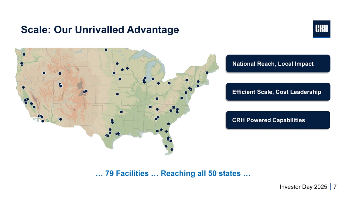 规模:我们无可匹敌的优势在全国范围内的影响力、在当地的有效规模、成本领先的CRH动力能力……79项设施……达到所有50个州……2025年投资者日7