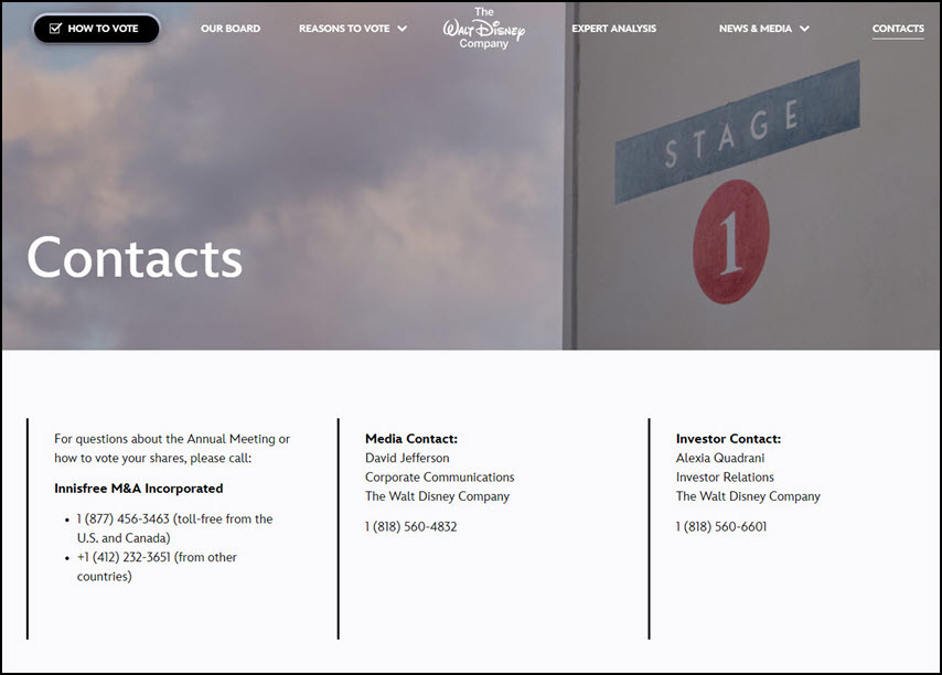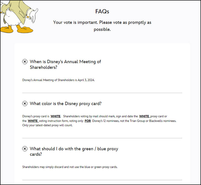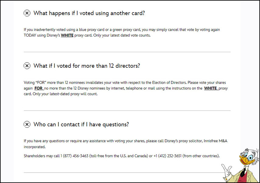 用别的卡投票会怎么样?如果你无意中使用蓝色代理卡或绿色代理卡投票,你可能会直接取消投票通过今天再次投票使用迪士尼的白色代理卡。只有你最近一次过时的投票算数,如果我投票给12个以上的董事怎么办?投票“支持”超过12名被提名人将使您在选举董事方面的投票无效。请再投票表决你的股份为不超过12名迪士尼提名者通过互联网、电话或邮件使用该网站上的说明白色代理卡。只有你最新的代理才算数。有问题可以联系谁?如果您有任何任务离子或需要任何协助投票您的股份,请致电迪士尼的代理律师,Innis-free M & A corporated。股东可拨打1(877)456-3463(美国、加拿大免费电话)或+ 1(412)232-36S1(其他国家)。